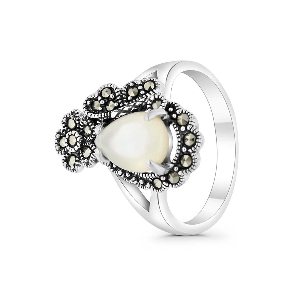 خاتم كلاسيكي أنيق مفعم بالتميز، مصنوع من الفضة الإسترليني ومزين بصدف أبيض طبيعي وحجر ماركاسيت. ارتديه بمفرده او مقرنا بقلادة واقراط مماثلة للحصول على اطلالة بجمال كلاسيكي غير عادي جاهز ليترك أثرا