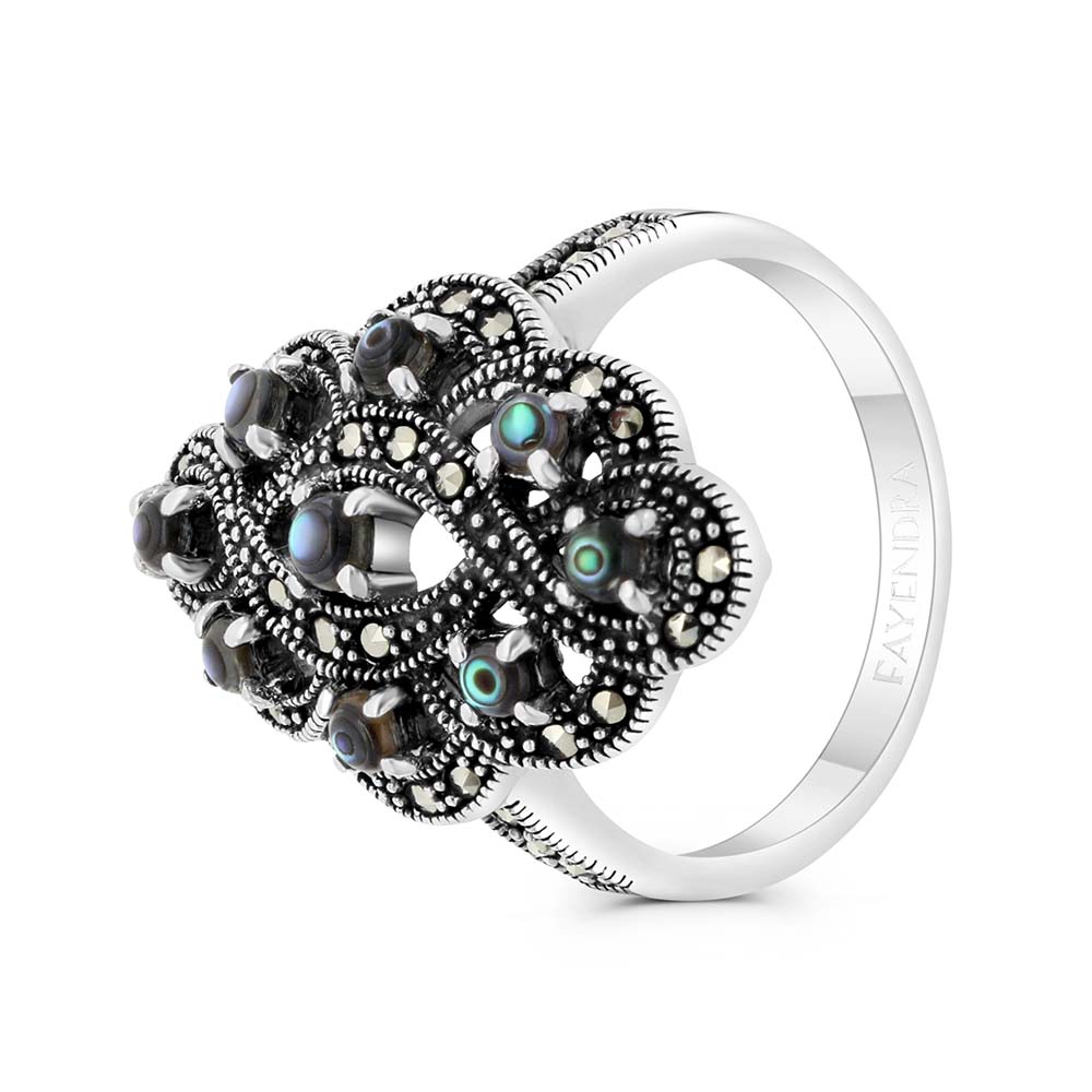 خاتم أنيق من الفضة الإسترليني عيار 925 من مجموعتنا الكلاسيكية ، يعرض مزيجًا من أحجار الماركاسيت وصدفة زرقاء طبيعية. سيكون هدية رائعة لسيدة ذات ذوق كلاسيكي.