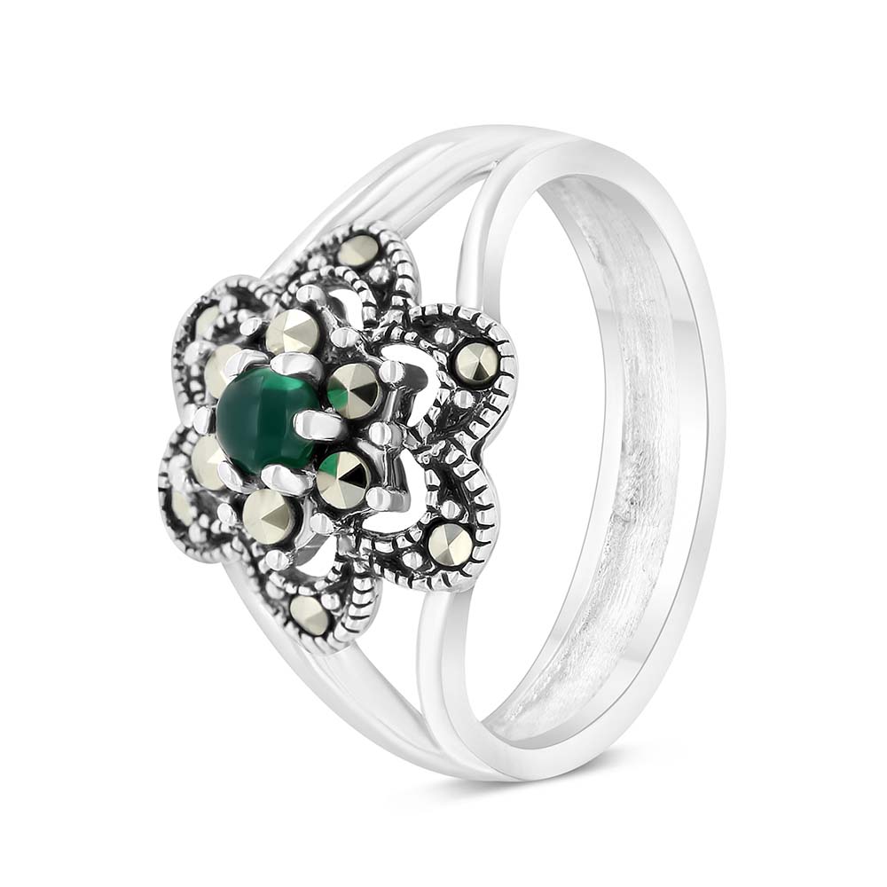 زيني اصبعك بزهرة أنيقة وجميلة من خلال خاتمنا الرقيق. يتميز الخاتم المصنوع من الفضة الإسترليني عيار 925 بزهرة في وسطه مرصعة بأحجار ماركاسيت صغيرة وعقيق أخضر طبيعي في وسطها ، ستكون هذه الزهرة بمثابة إلهام لسيدة تزهر وتتفتح بغض النظر عن الطقس أو الحالة.
