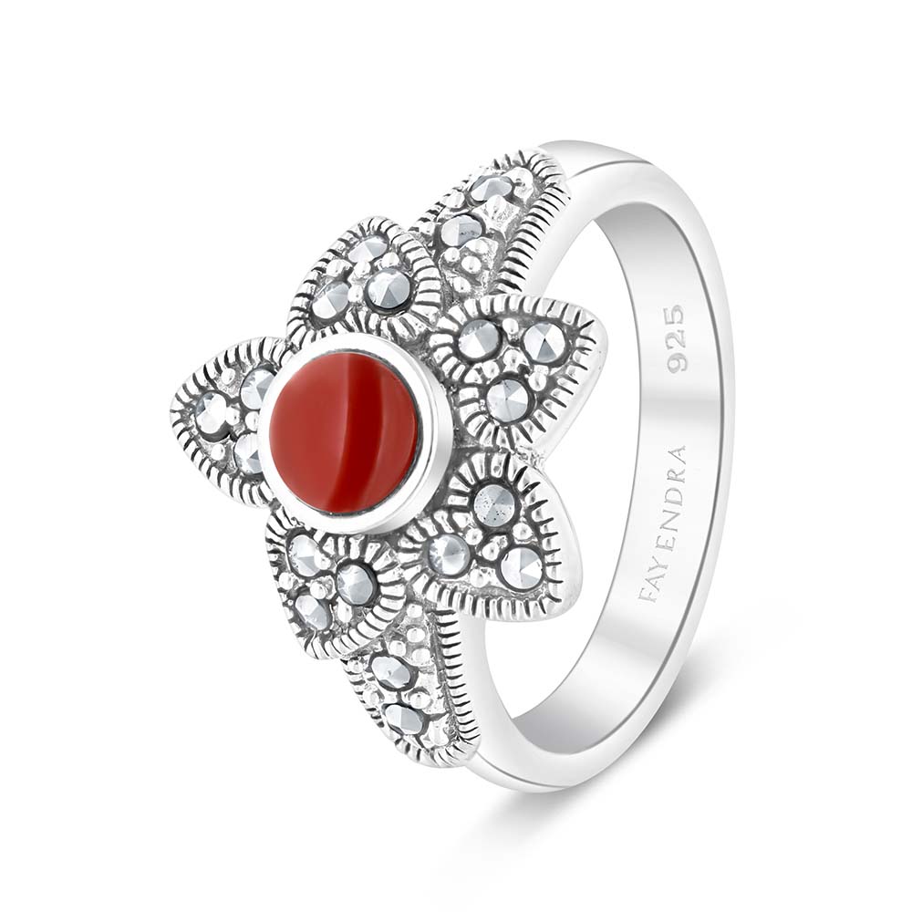 زيني اصبعك بنقاء وجمال الزهور الرقيقة. الخاتم المصنوع من الفضة الإسترليني عيار 925 مزين بحجر العقيق الأحمر والماركاسيت المرصع لبتلاته اللامعة.