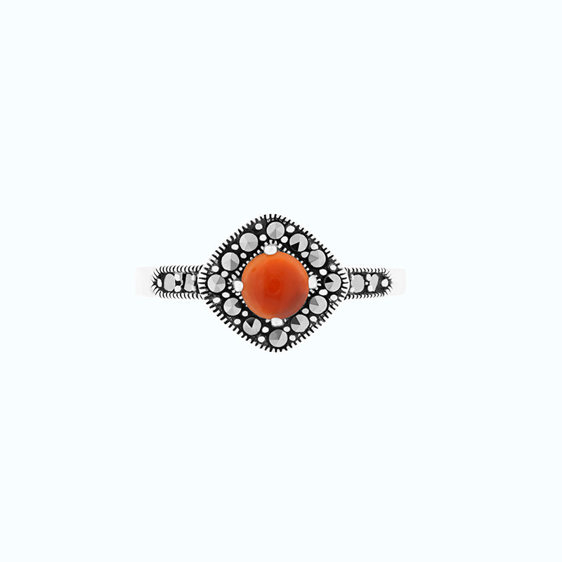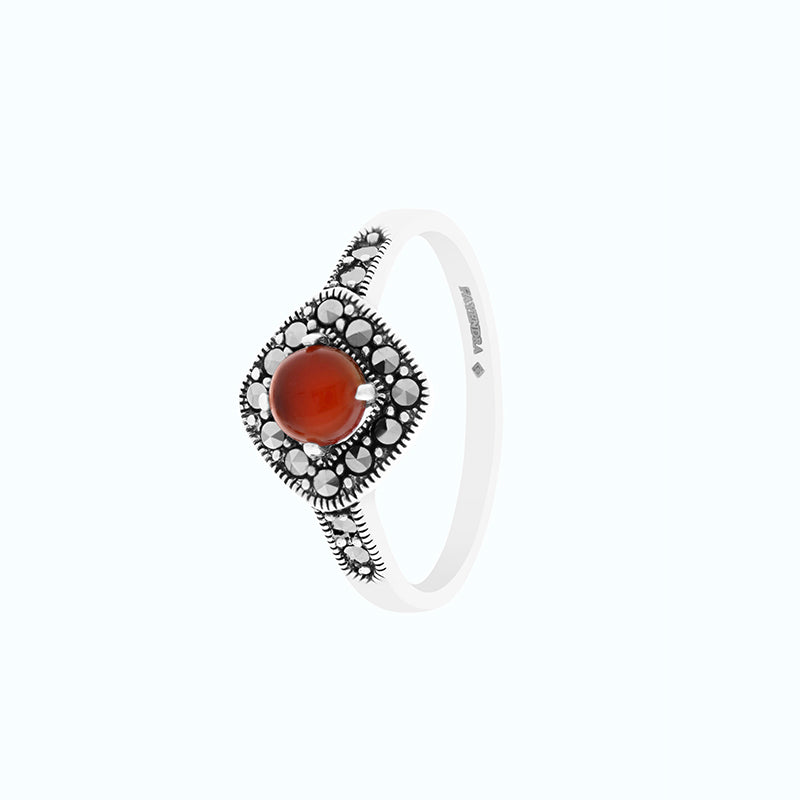 خاتم أنيق ملائم لكلّ مناسبة من الفضة الإسترلينية عيار 925 من مجموعتنا الكلاسيكية. يتمتع الخاتم بجاذبية خالدة بفضل أحجار الماركاسيت اللامعة وحجر العقيق الأحمر في المنتصف. ارتديه وحده أو نسقيه مع أقراط مماثلة.