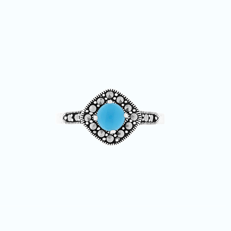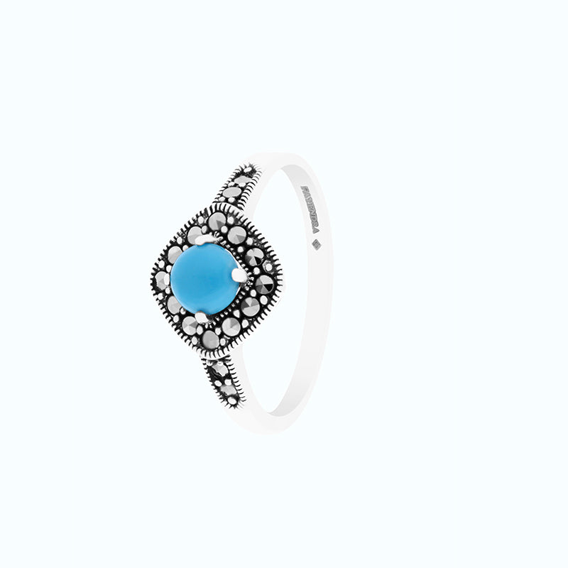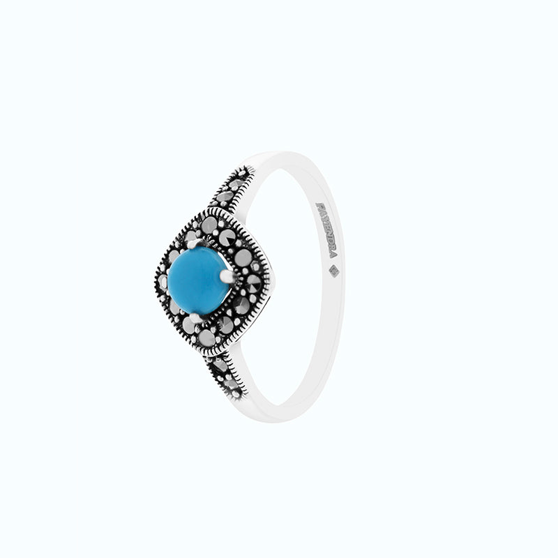 خاتم أنيق ملائم لكلّ مناسبة من الفضة الإسترلينية عيار 925 من مجموعتنا الكلاسيكية. يتمتع الخاتم بجاذبية خالدة بفضل أحجار الماركاسيت اللامعة وحجر الفيروز في المنتصف. ارتديه وحده أو نسقيه مع أقراط مماثلة.