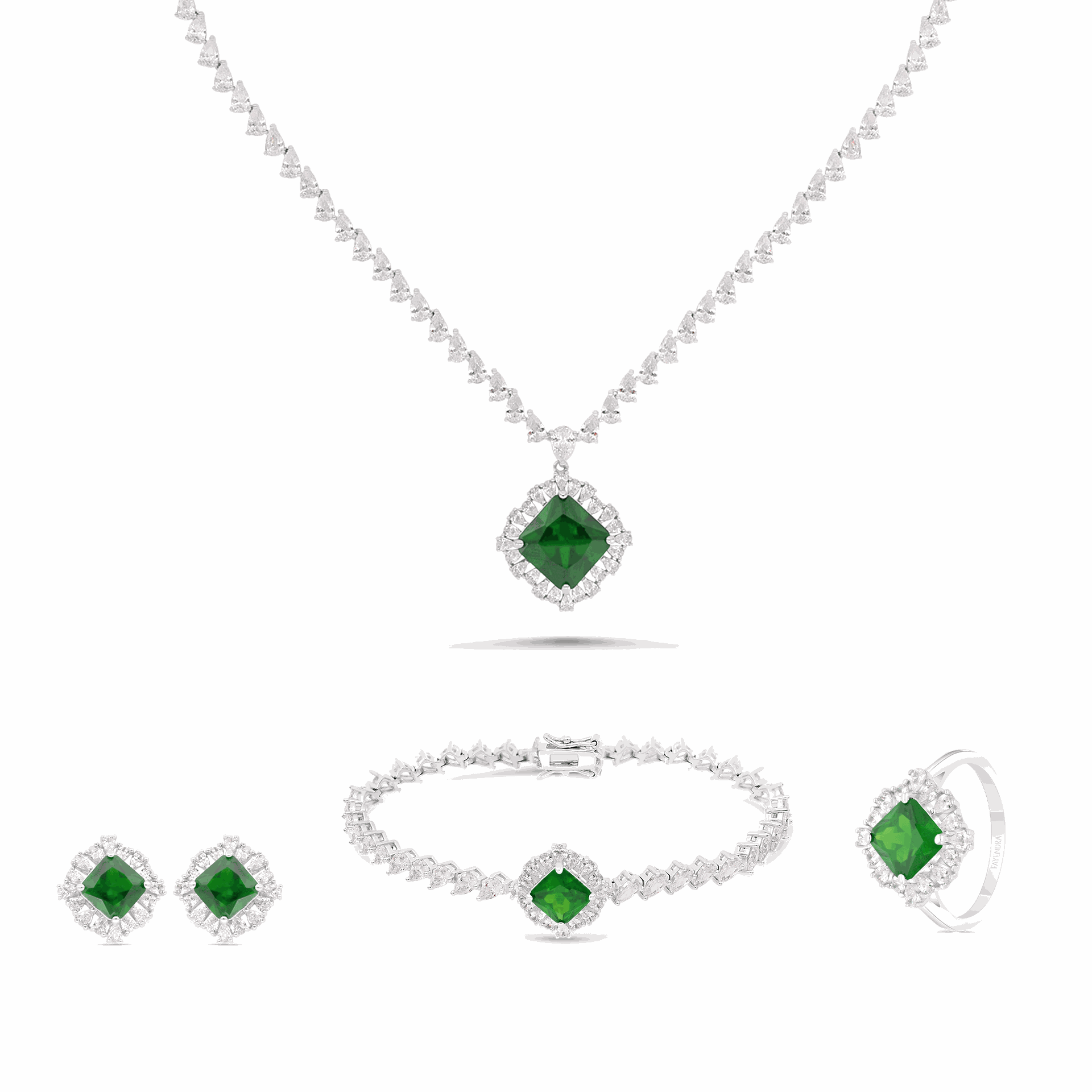 كوني محط الأنظار في مناسبتك القادمة مع هذا الطقم الراقي من فايندرا، المشغول على نحو رائع من الفضة الاسترلينية عيار 925 والمطلي بالروديوم للمزيد من المتانة واللمعان. الطقم الفاخر يتألف من عقد، سوار، خاتم، وأقراط. وترصعه بشكل كامل أحجار الزركون اللامعة. المتفاوتة بين أحجار مركزية من الزركون الزمردي بقصة رادينات، ,واحجار من الزركون الأبيض تحيط بها. الخيار المثالي لسيدة تعشق الفخامة والتميّز.