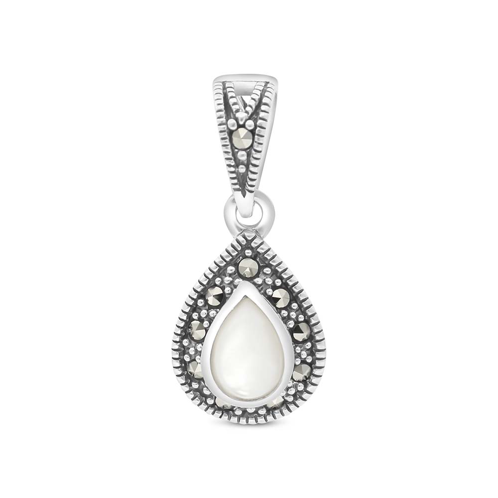 مجوهرات كلاسيكية وأنيقة ستعكس ذوقك الفريد والمميز ، قلادة من الفضة الإسترلينية من فايندرا مزينة بالصدف الأبيض وأحجار الماركاسيت اللامعة. طابقيها مع اقراط مماثلة واشعري بالفخامة والجمال مع مجوهراتنا الفاتنة.