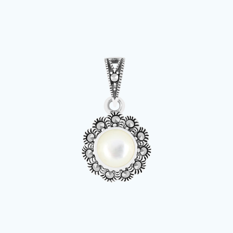 مستوحاة من الطبيعة ومشغولة على نحو رائع من الفضة الاسترلينية عيار 925، هذه القلادة الرائعة هي الخيار المثالي لتتألقي هذا الموسم. يرصعها حجر صدف أبيض في مركزها تحيط به أحجار الماركاسيت اللامعة مشكلة البتلات.