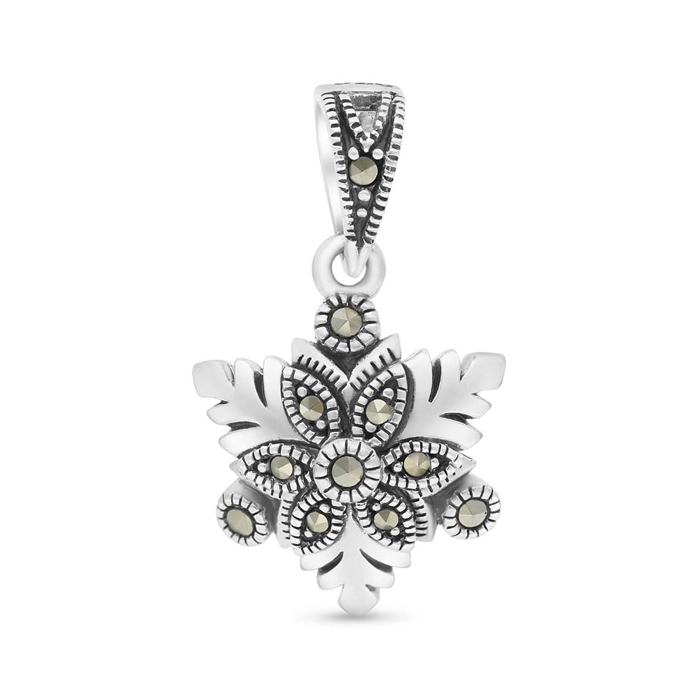 أحضري الطبيعة الجميلة إلى خزانة ملابسك مع قلادتنا الجميلة. قلادة من الفضة الإسترليني عيار 925 مرصعة بأحجار ماركاسيت تزين التصميم المستوحى من البتلات والأوراق. هذه القلادة هي إعادة تجسيد إبداعية للجمال الذي نجده في الطبيعة ، وستضفي لمسة رقيقة على مظهرك اليومي، خصوصا اذا ما تم اقرانها مع أقراط بالتصميم نفسه.