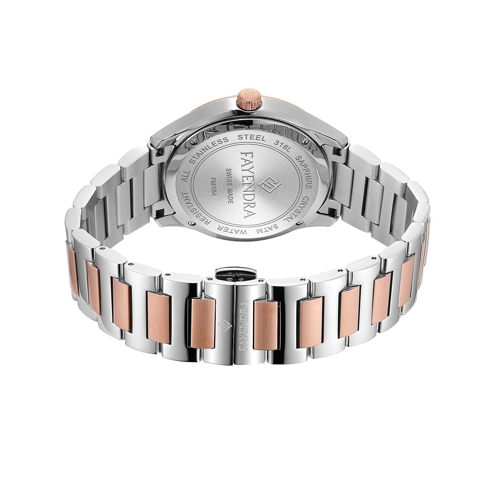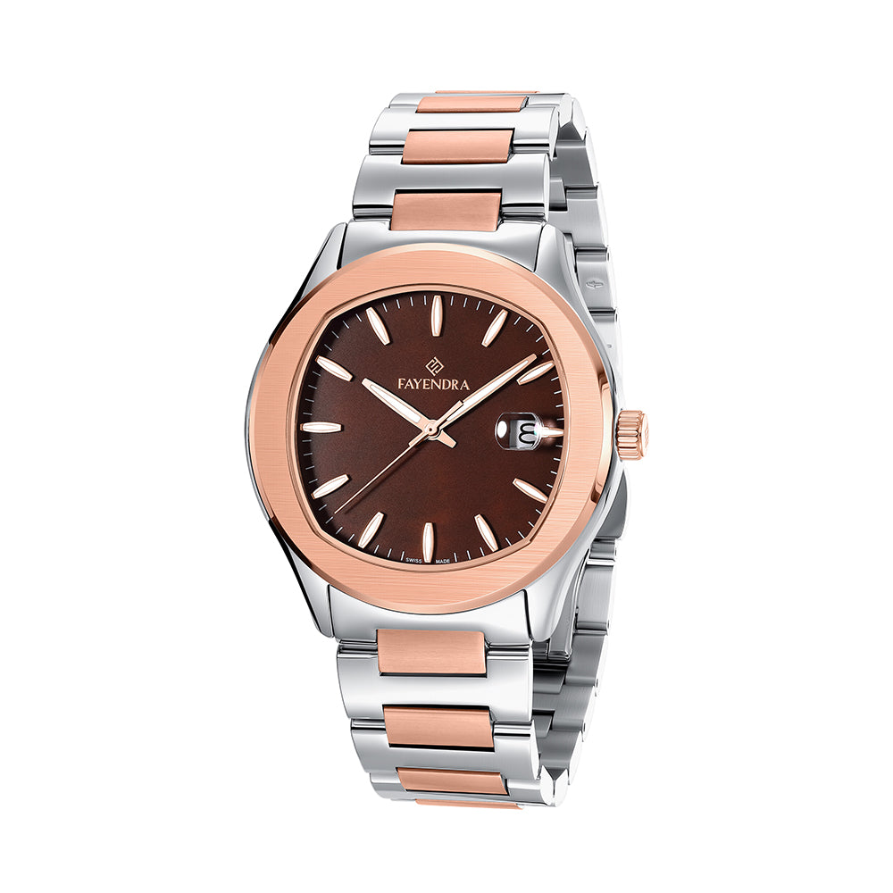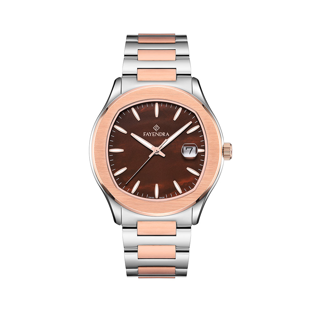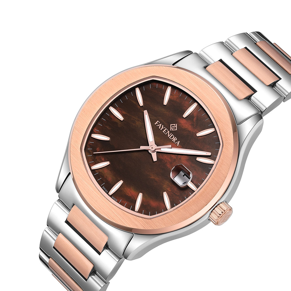 ساعة رجالي ستانلس ستيل عيار 316 بلون فضي و ذهبي روز - مينا حجر صدف ام اللالئ البني