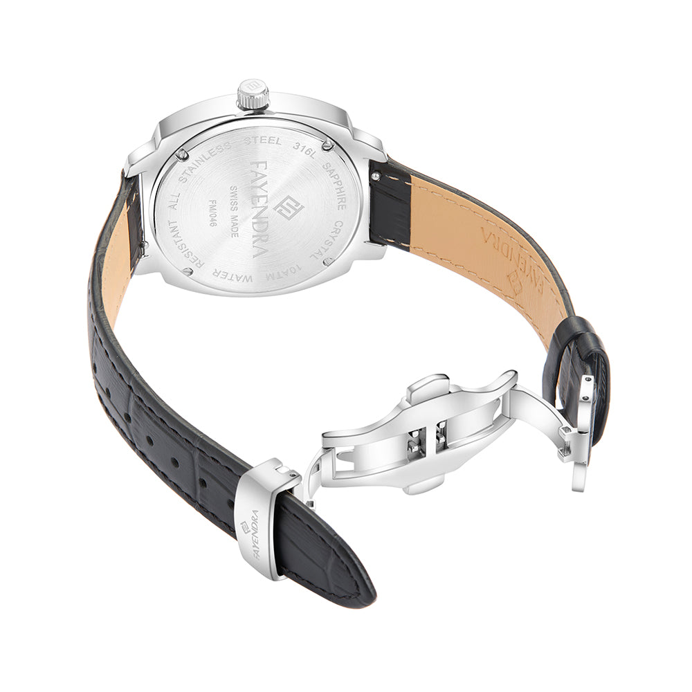امنح إطلالتك لمسة من الفخامة الرجولية مع هذه الساعة الأنيقة من فايندرا , المصنوعة من ستانلس ستيل عيار L316 باللون الفضي المصقول تعد هذه الساعة عصرية لسوارها المصنوع من الجلد بلون الأسود الذي يمنح بعض من الفخامة تمتاز أيضا بمينا سوداء ذات ارقام رومانية فضية اللون لتضفي شعور الاناقة وتحتوي ايضا على دائرة لتميز الدقايق. تحميها طبقة زجاج من الزفير المقاوم للماء والخدوش والصدمات، لتقدّم لك ساعة تجمع بين الأداء الموثوق والفخامة التي ترافقك في كل ايامك . انتهز الفرصة واشتريها الان !