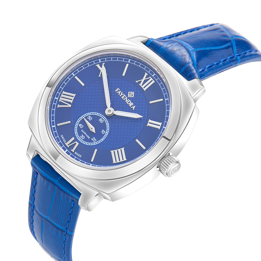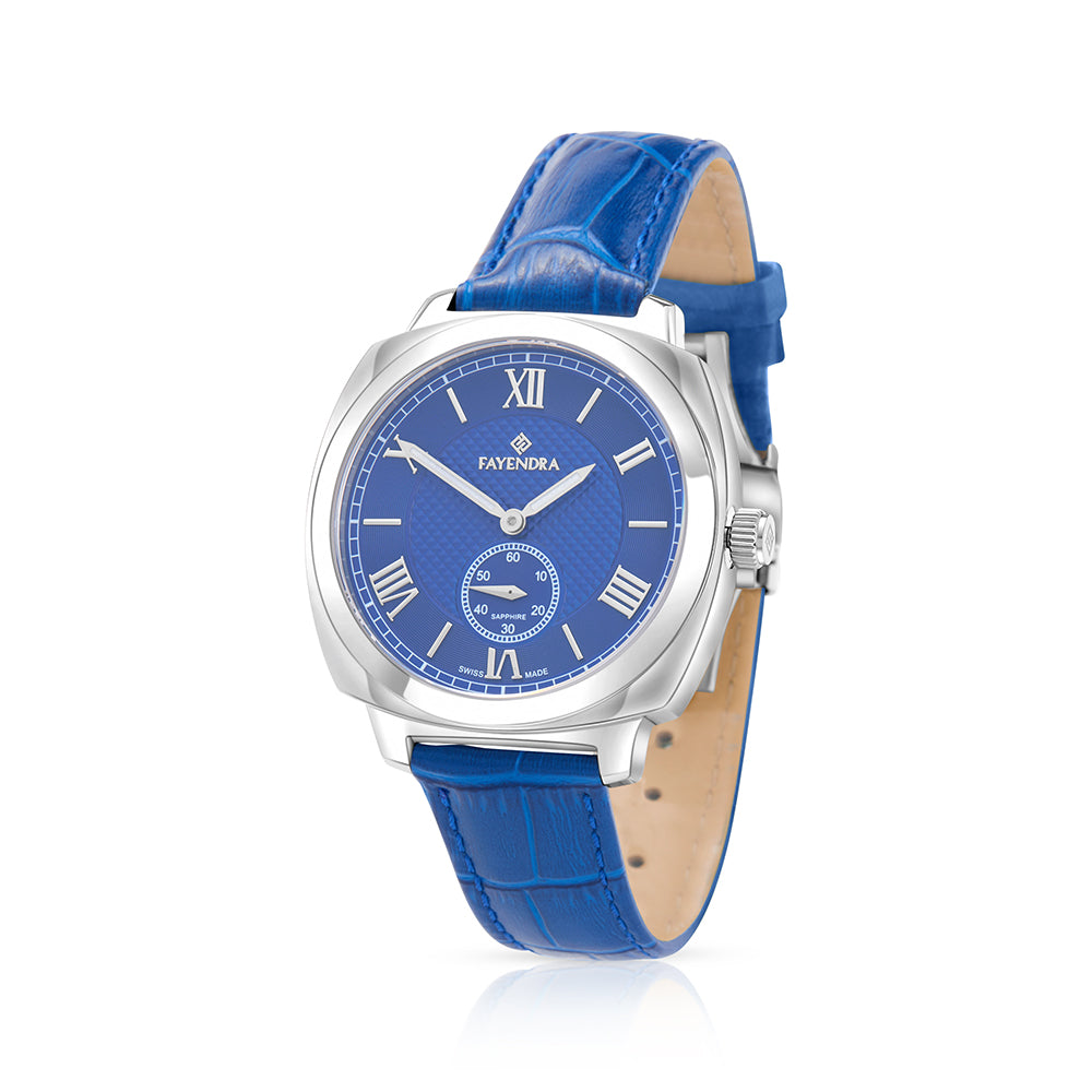 امنح إطلالتك لمسة من الفخامة الرجولية مع هذه الساعة الأنيقة من فايندرا , المصنوعة من ستانلس ستيل عيار L316 باللون الفضي المصقول تعد هذه الساعة عصرية لسوارها المصنوع من الجلد بلون أزرق الذي يمنح بعض من الفخامة تمتاز أيضا بمينا زرقاء اللون , ذات ارقام رومانية فضية لتضفي شعور الاناقة وتحتوي ايضا على دائرة لتميز الدقايق. تحميها طبقة زجاج من الزفير المقاوم للماء والخدوش والصدمات، لتقدّم لك ساعة تجمع بين الأداء الموثوق والفخامة التي ترافقك في كل ايامك . انتهز الفرصة واشتريها الان !