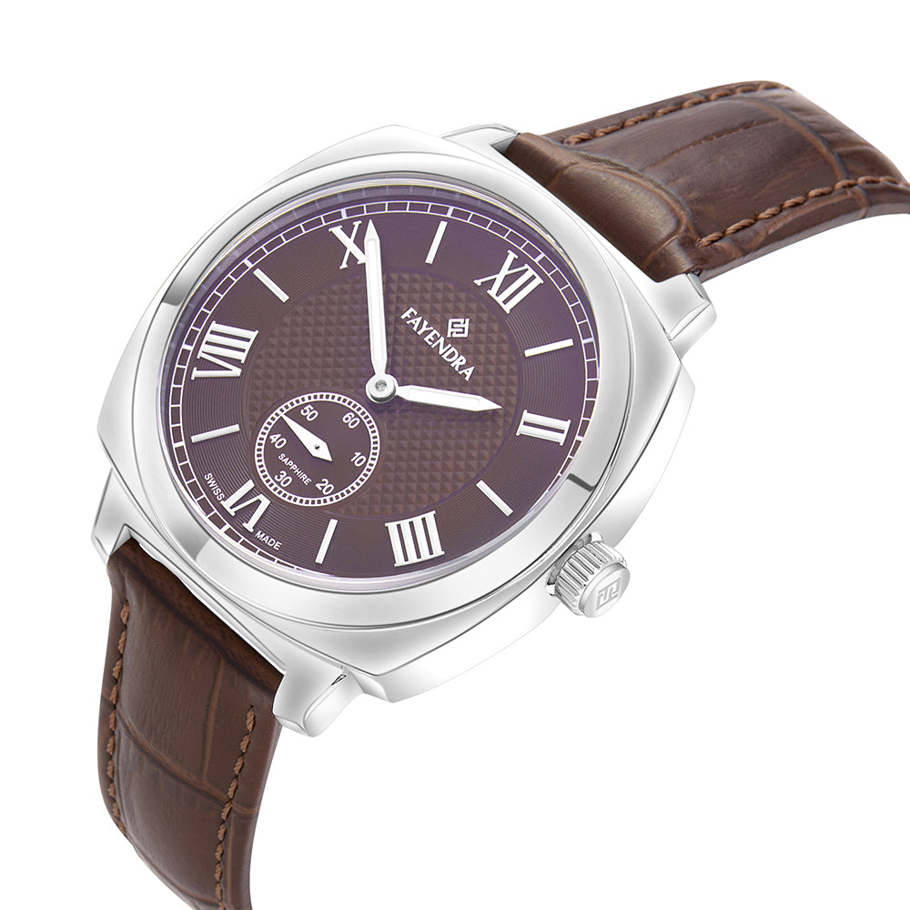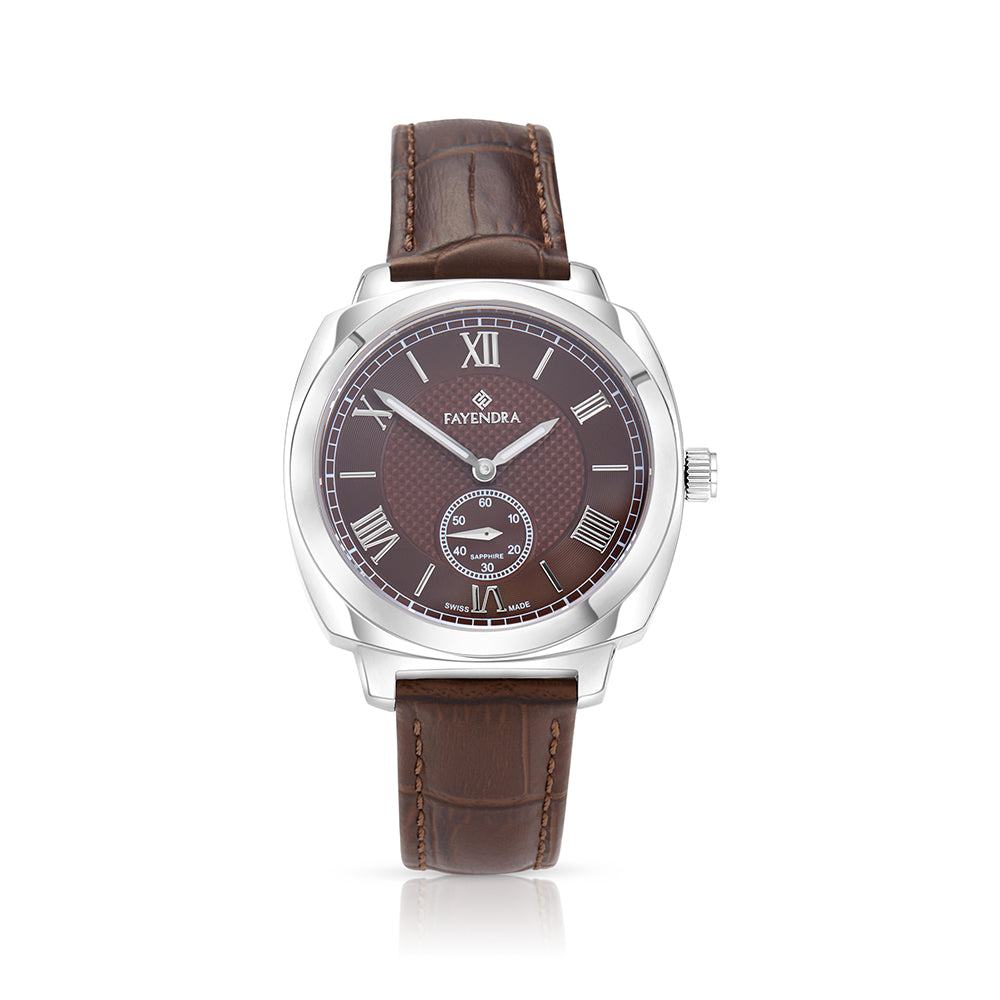 امنح إطلالتك لمسة من الفخامة الرجولية مع هذه الساعة الأنيقة من فايندرا , المصنوعة من ستانلس ستيل عيار L316 باللون الفضي المصقول. تعد هذه الساعة عصرية لتوافق السوار والمينا باللون ذاته وهو اللون البني فالسوار مصنوع من الجلد ليعطي ايحاء بالفخامة, تمتاز أيضا بمينا ذات ارقام رومانية فضية تضفي شعور الاناقة وتحتوي ايضا على دائرة لتميز الدقايق. تحميها طبقة زجاج من الزفير المقاوم للماء والخدوش والصدمات، لتقدّم لك ساعة تجمع بين الأداء الموثوق والفخامة التي ترافقك في كل ايامك . انتهز الفرصة واشتريها الان !