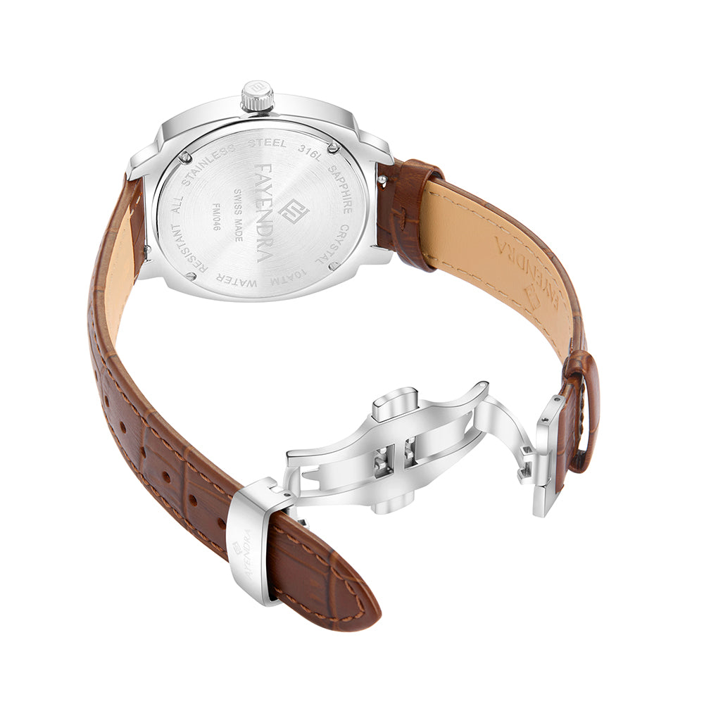 ساعة رجالي ستانلس ستيل عيار L316 بلون فضي جلد بني - مينا معدنية باللون البني