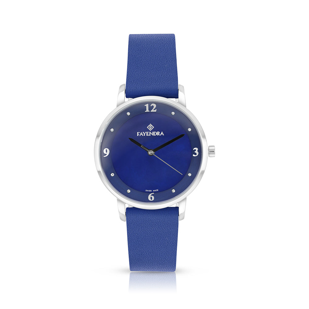 ساعة ستانلس ستيل عيار 316 بلون فضي جلد أزرق - المينا حجر صدف ام اللالئ الازرق