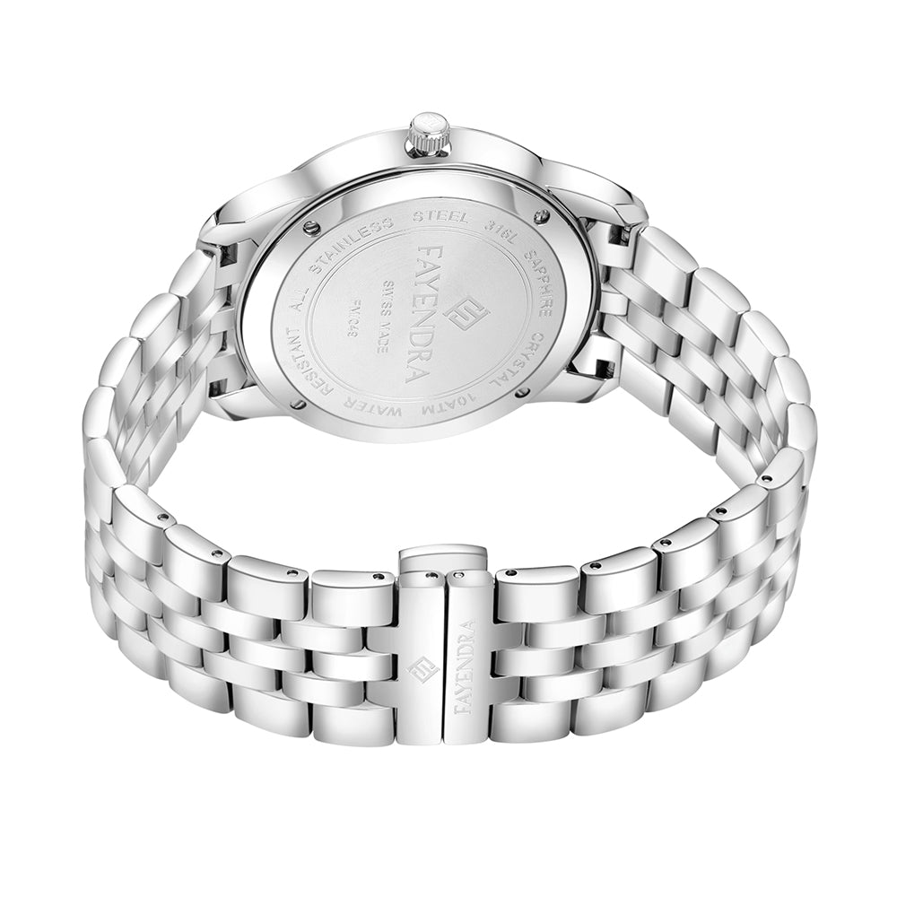تمتع بمظهر الفخامه مع ساعة من فايندرا، مصنوعة من الستانلس ستيل عيار 316L المقاوم للصدأ, و مطلية بالفضي، مزوده بماكينة روندا السويسرية من افضل مصانع الساعات في العالم، و بمينا مصنوع من صدف ام اللألئ الأسود، يغطيه زجاج مصنوع من الزفير المقاوم للخدش و الماء حتى عمق 100 متر, و محاط بإطار دائري رفيع املس, تزدان عقارب الساعة و أرقامها باللون الفضي, حيث تظهر بشكل خطوط مائله تمنح قراءة واضحة وحديثة, مع وجود نافذة تاريخ ذكية بجانب الرقم 3 تضيف بعداً عملياً فاخراً, يكتمل جمال التصميم بسوار معدني بنمط مترابط, يمنحك طابعاً رجولياً انيقاً, تناسب الإرتداء اليومي و المناسبات الرسمية, اقتنيها الآن!
