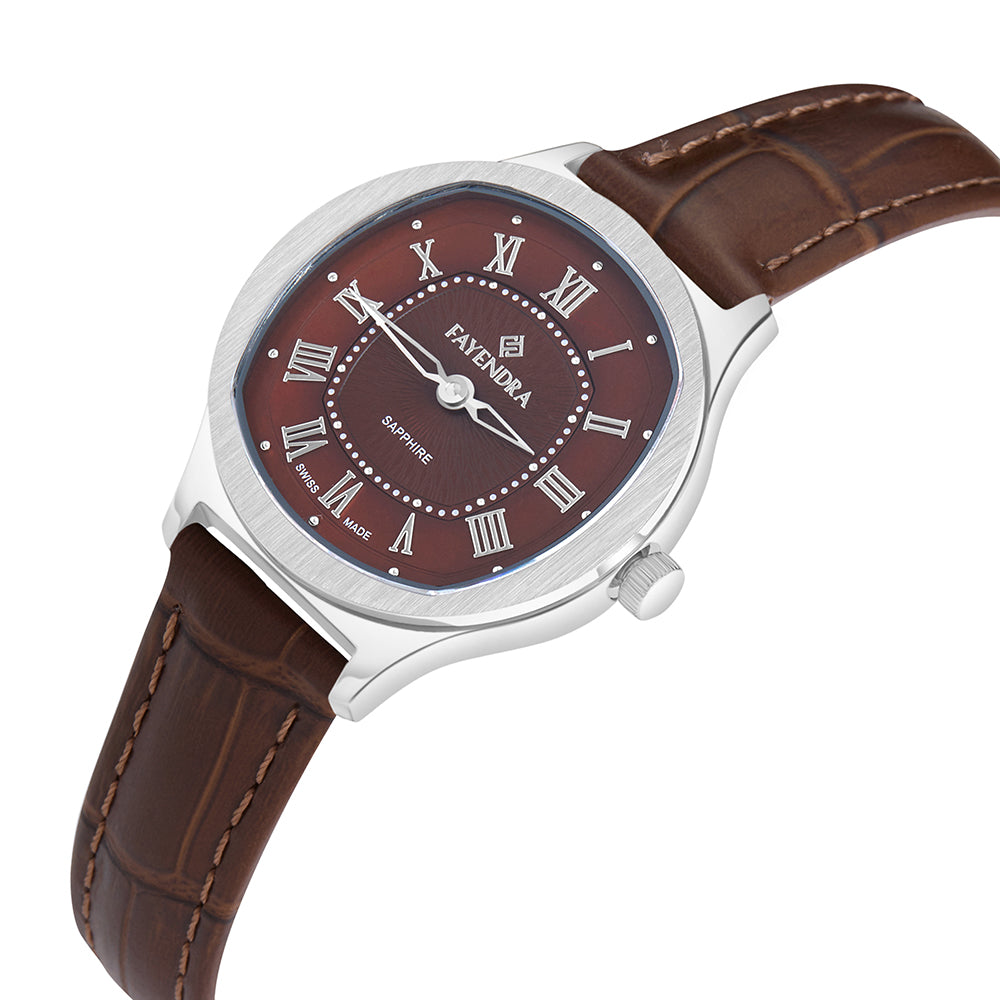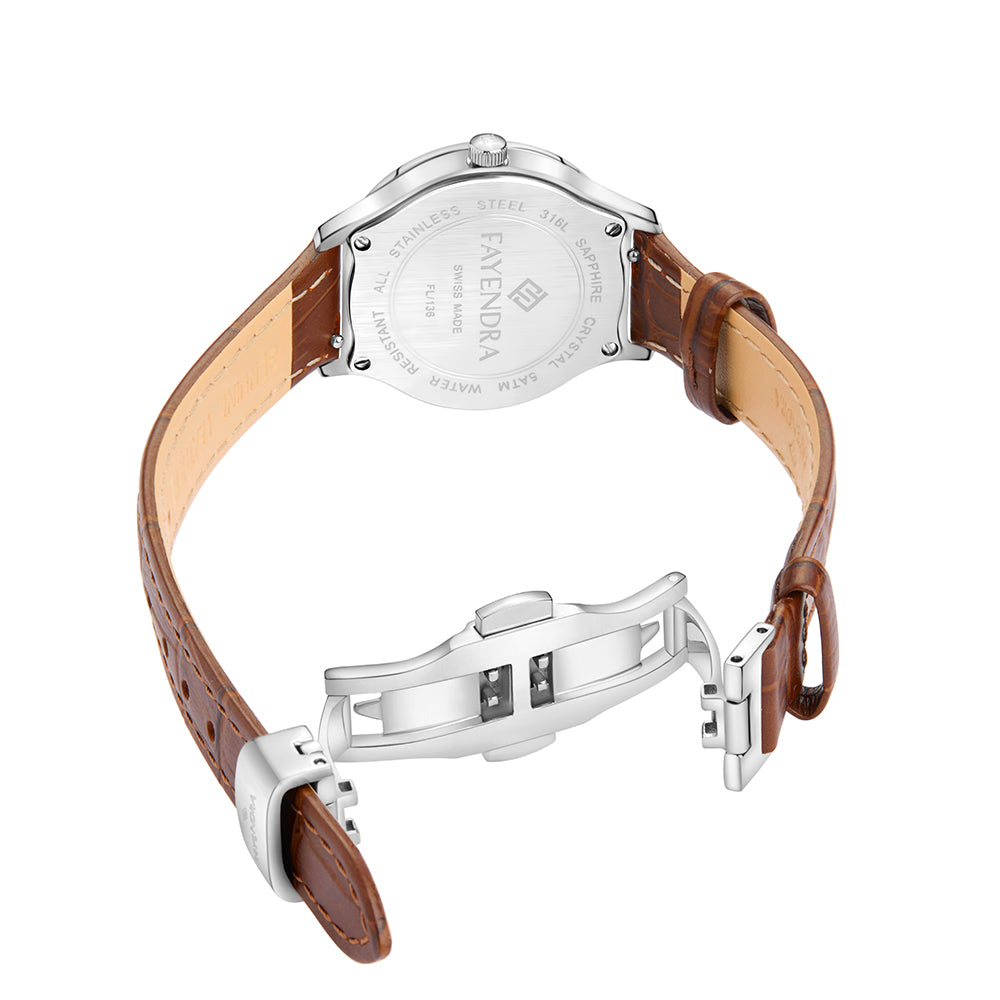 اكشف عن ذوقك الراقي المفعم بالفخامة مع هذه الساعة من فايندرا. بعيار ستانليس ستيل L316يتماثل لون سوار الساعة والمينا بلون ام الالئ بني الفاخر الذي يعطي إحساس بالفخامة , عقارب الساعة وارقامها تتميز بلونها الأبيض اللامع الذي يعطي إحساس بالرقي الفاخر , يتكون سوار الساعة من الجلد. تعمل الساعة بدقة عالية بفضل ماكينة روندا السويسرية الشهيرة التي تحميها طبقة زجاج من الزفير المقاوم للماء والخدوش والصدمات مما يجعلها ساعة فاخرة ترافقك في كل مكان وبكل ثقة, هذه الساعة تناسبك في أوقاتك اليومية وفي المناسبات المهمة. فسارع بالشراء الان !