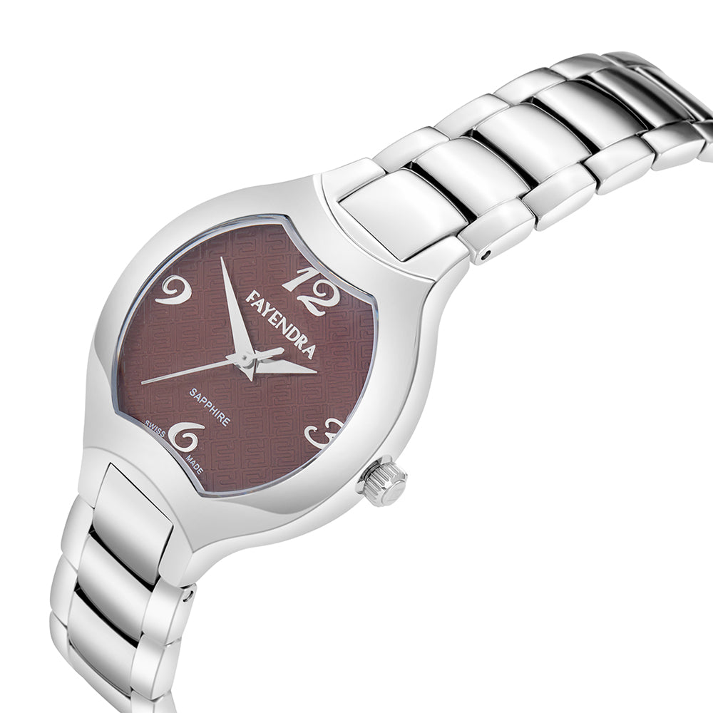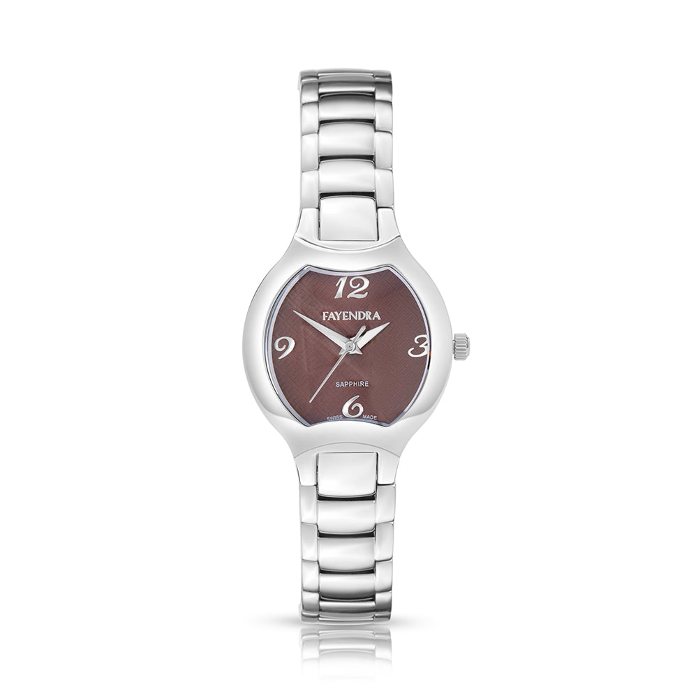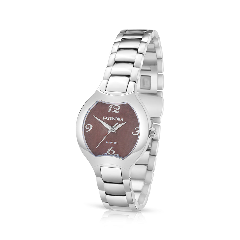 ويكمّل سوار الستانلس ستيل المصقول بالحلقات العريضة مظهر الساعة الفاخر، ليمنحها لمعانًا معدنيًا يعكس جمال اللون البني المتناغم مع الفضي.