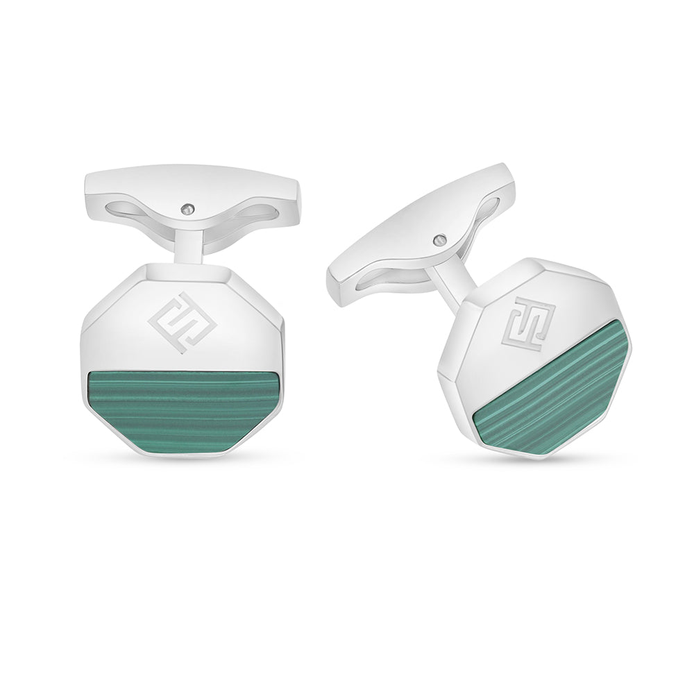 عبّر عن ذوقك الرفيع واجعل منه بصمتك الخاصة مع هذا الكبك المميز من فايندرا، المصنوع من ستانلس ستيل فاخر عيار 316L. يتميز بتصميم سداسي لامع مقسوم من المنتصف، حيث يزين أحد جانبيه حجر ملاكايت ساحر بتدرجاته اللونية الخلابة، بينما يتوسط الجانب الآخر شعار فايندرا الأنيق. تصميم يجمع بين الجرأة والجاذبية في إطلالة واحدة متفردة. تسوّق الآن!