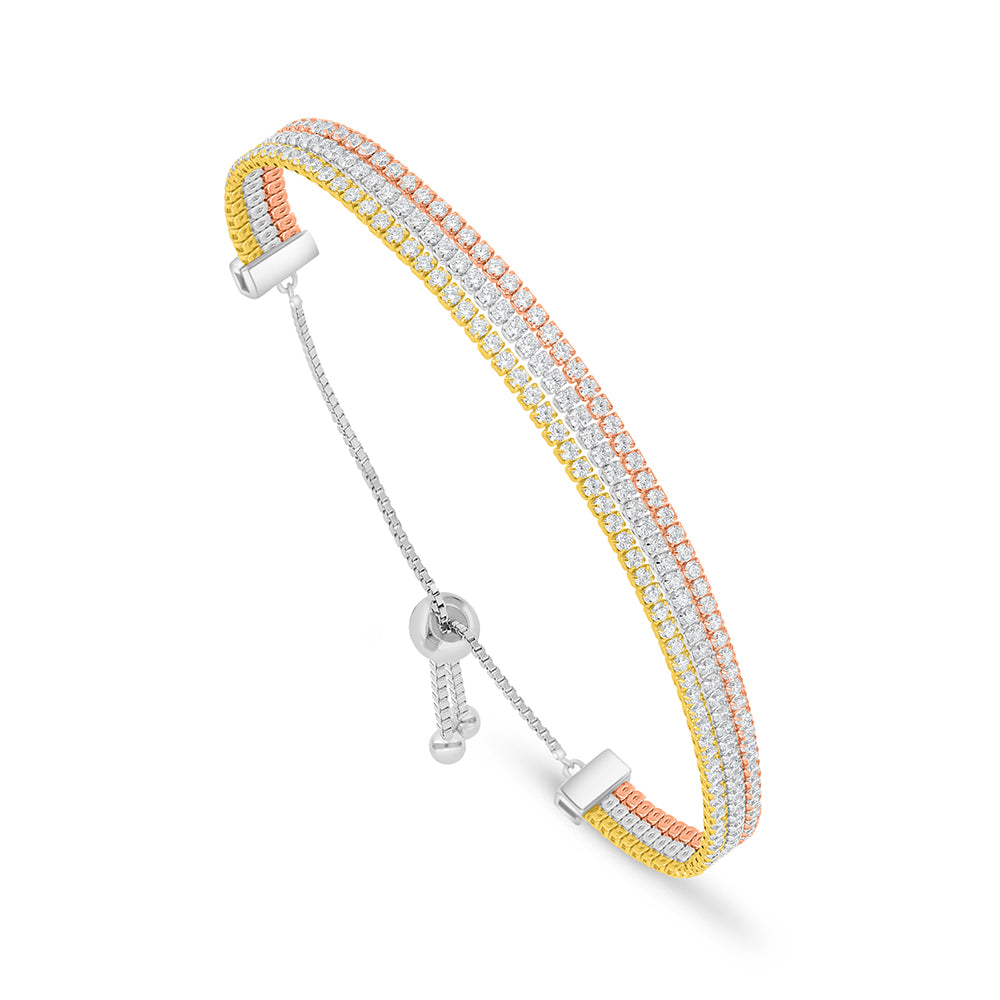 تألّقي بسحرٍ لا يُقاوم مع سوار فايندرا المصنوع من الفضة الخالصة عيار 925 والمطلي بالروديوم والذهب الأصفر والروز، يتزيّن بثلاثة صفّوف متلألئة من أحجار الزركون الأبيض تمتد بانسيابية على كامل التصميم ليمنح معصمكِ بريقًا راقيًا وأناقة لافتة. قطعة تجمع بين الجمال العملي والفخامة الهادئة. فتألّقي بها اليوم!