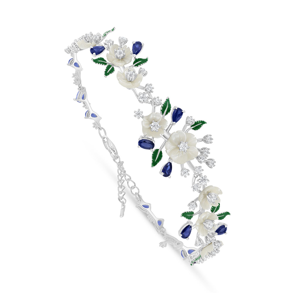 اسورة من الفضة الخالصة عيار 925 مطلية روديوم مرصعة صدف ابيض و زفير كروندوم