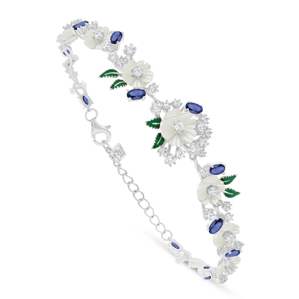 اسورة من الفضة الخالصة عيار 925 مطلية روديوم مرصعة صدف ابيض و زفير كروندوم و فص ابيض