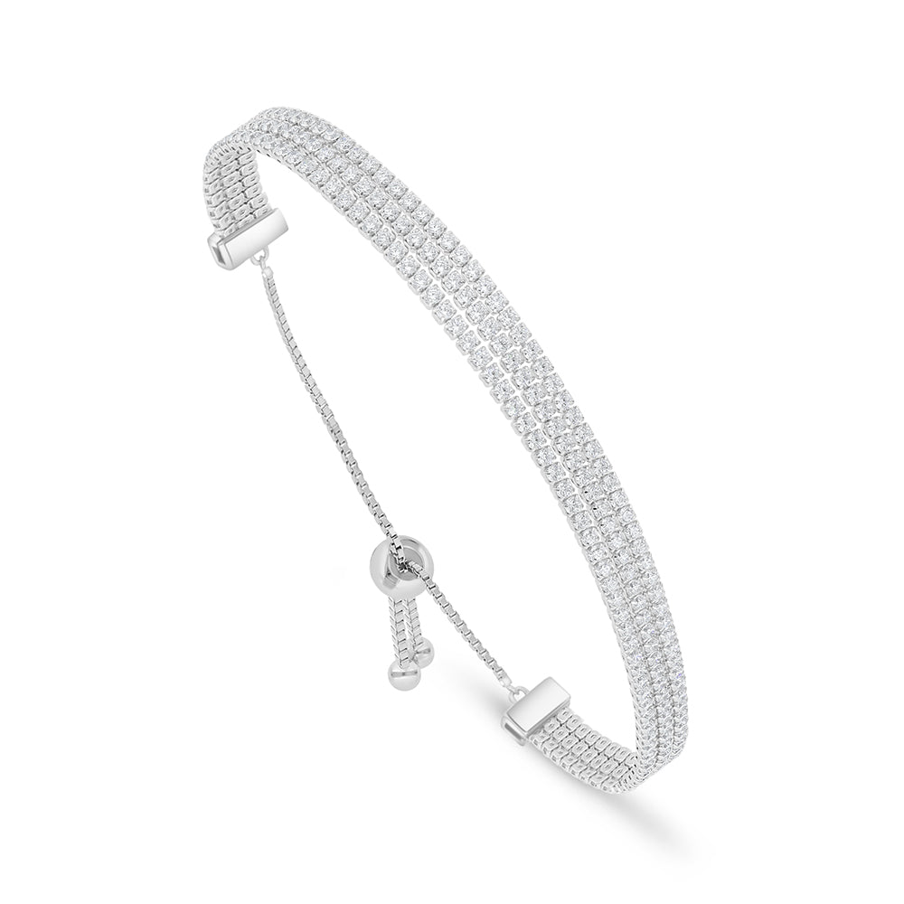 Total Weight: 10.1g تألّقي بسحرٍ لا يُقاوم مع سوار فايندرا المصنوع من الفضة الخالصة عيار 925 والمطلي بالروديوم، يتزيّن بثلاثة صفّوف متلألئة من أحجار الزركون الأبيض تمتد بانسيابية على كامل التصميم ليمنح معصمكِ بريقًا راقيًا وأناقة لافتة. قطعة تجمع بين الجمال العملي والفخامة الهادئة. فتألّقي بها اليوم!