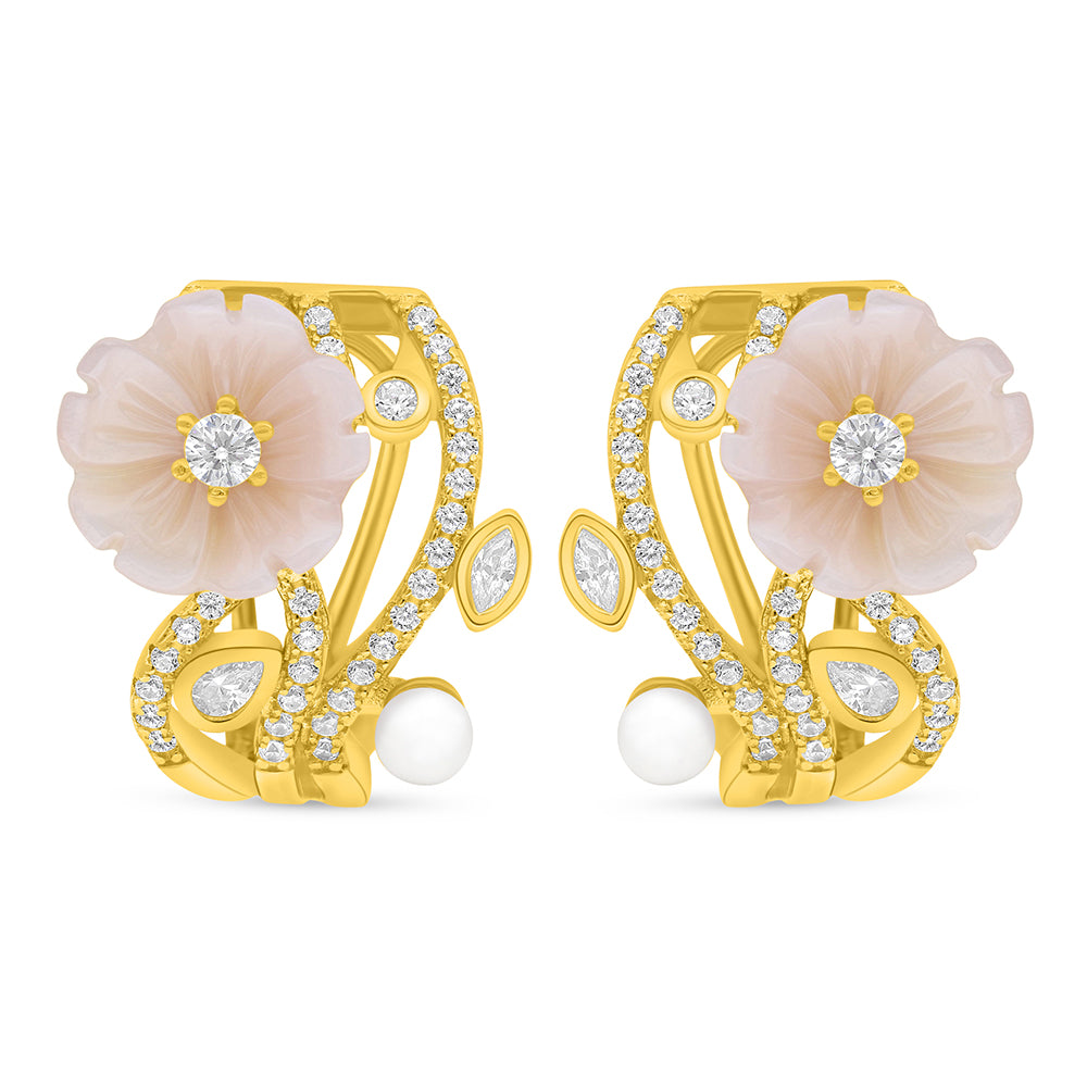 Total Weight: 6.8g دلّلي نفسك بأقراط من فايندرا، مصاغة من الفضّة الخالصة عيار 925 والمطلية باللون الذهبي الآسر. يزدان تصميمها بزهور كبيرة من الصدف الزهري الطبيعي، تتدلى منها أغصان متلألئة مرصعة بأحجار الزركون الأبيض بقصّات لامعة تنثر الضوء بجاذبية آسرة. قطعة تنسج لك حضورًا مميزًا يليق بأناقة أمسياتك الراقية. نسّقيها مع الخاتم المطابق لتكتمل إطلالتك الساحرة. اقتنيها الآن واجعليها سرّ تألقك الفريد!