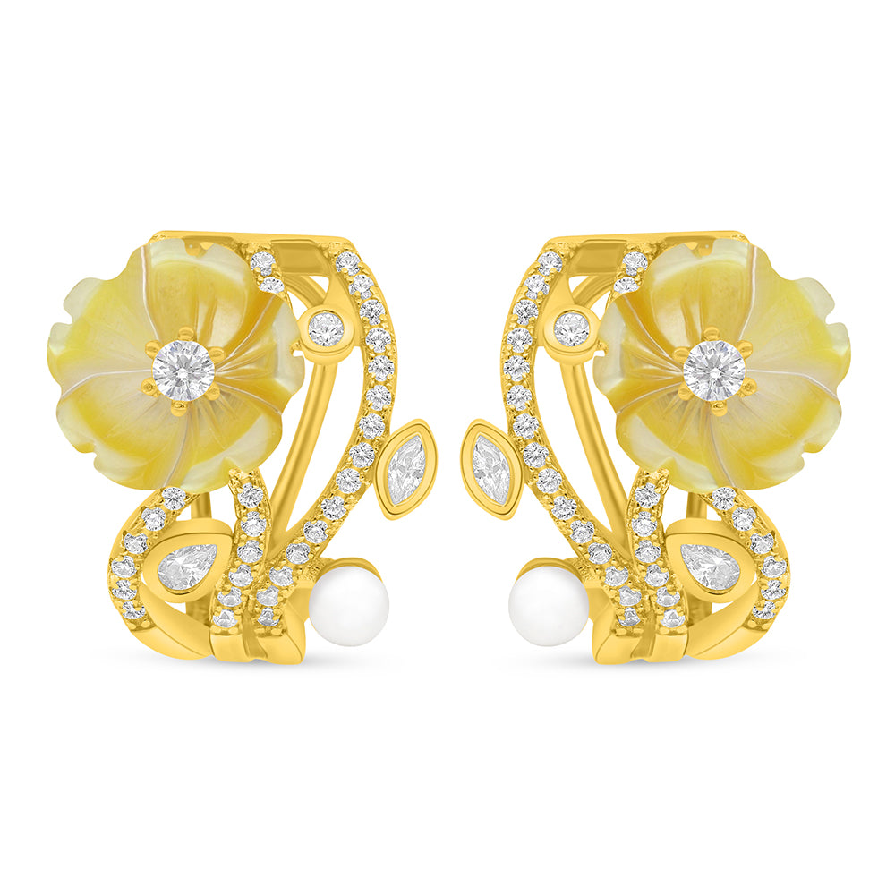 Total Weight: 6.8g دلّلي نفسك بأقراط من فايندرا، مصاغة من الفضّة الخالصة عيار 925 والمطلية باللون الذهبي الآسر. يزدان تصميمها بزهور كبيرة من الصدف الأصفر الطبيعي، تتدلى منها أغصان متلألئة مرصعة بأحجار الزركون الأبيض بقصّات لامعة تنثر الضوء بجاذبية آسرة. قطعة تنسج لك حضورًا مميزًا يليق بأناقة أمسياتك الراقية. نسّقيها مع الخاتم المطابق لتكتمل إطلالتك الساحرة. اقتنيها الآن واجعليها سرّ تألقك الفريد!