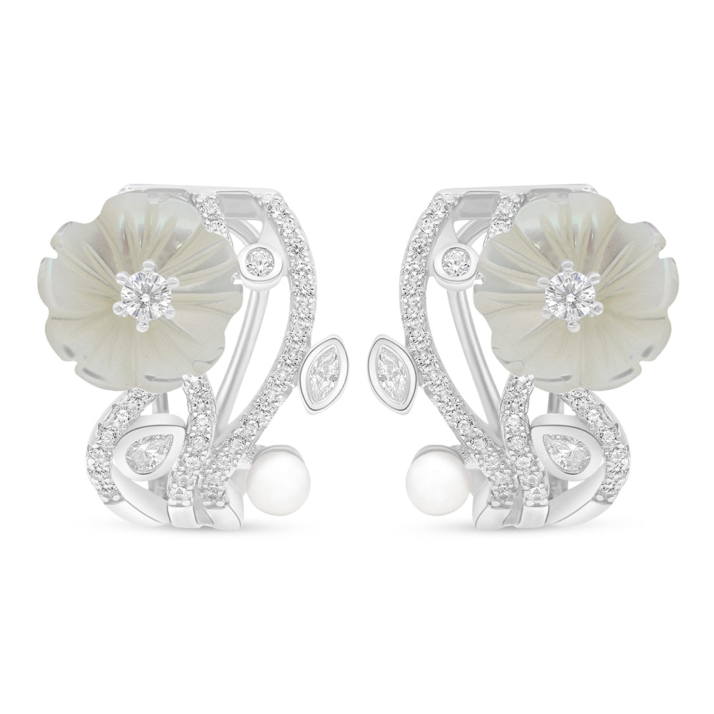 Total Weight: 6.8g دلّلي نفسك بأقراط من فايندرا، مصاغة من الفضّة الخالصة عيار 925 والمطلية بالروديوم لتحافظ على بريقها الآسر. يزدان تصميمها بزهور كبيرة من الصدف الأبيض الطبيعي، تتدلى منها أغصان متلألئة مرصعة بأحجار الزركون الأبيض بقصّات لامعة تنثر الضوء بجاذبية آسرة. قطعة تنسج لك حضورًا مميزًا يليق بأناقة أمسياتك الراقية. نسّقيها مع الخاتم المطابق لتكتمل إطلالتك الساحرة. اقتنيها الآن واجعليها سرّ تألقك الفريد!