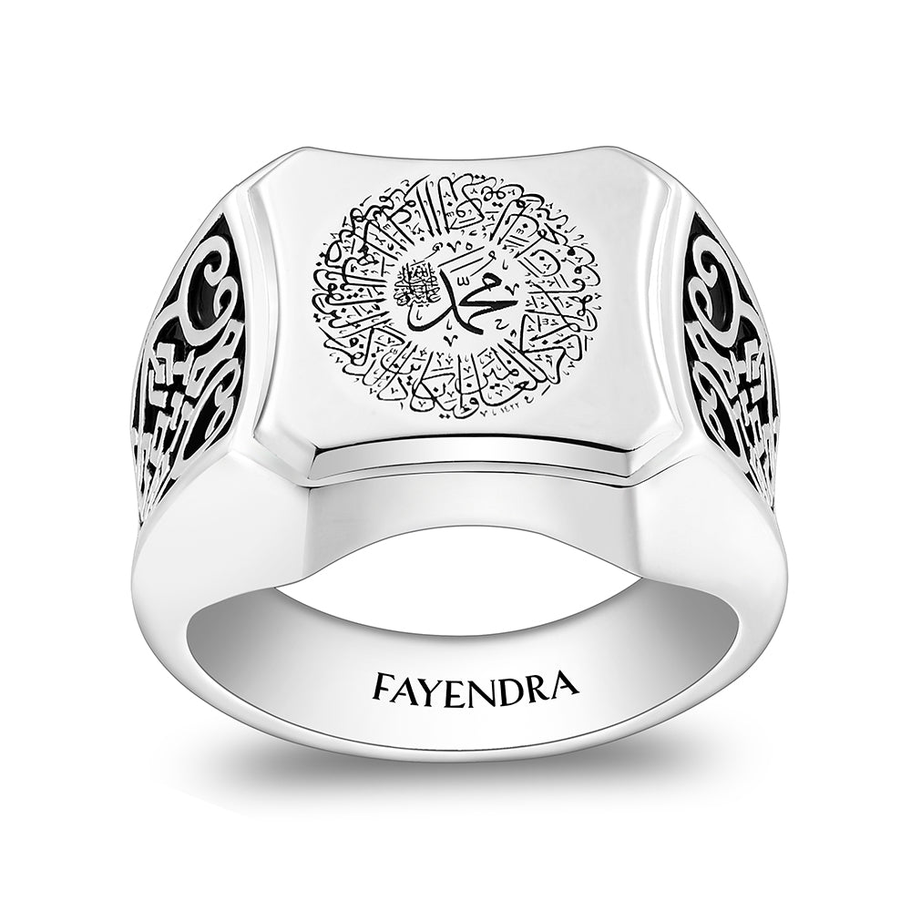 Total Weight:  11.5 g خاتم فايندرا الرجالي، مزيج فاخر من الإيمان والأناقة، مصنوع من الفضة الخالصة عيار 925، ومطلي بطبقة من الروديوم مع لمسات من الطلاء الأسود. يتميز الخاتم بنقوش إسلامية دقيقة، أبرزها الآية الكريمة: