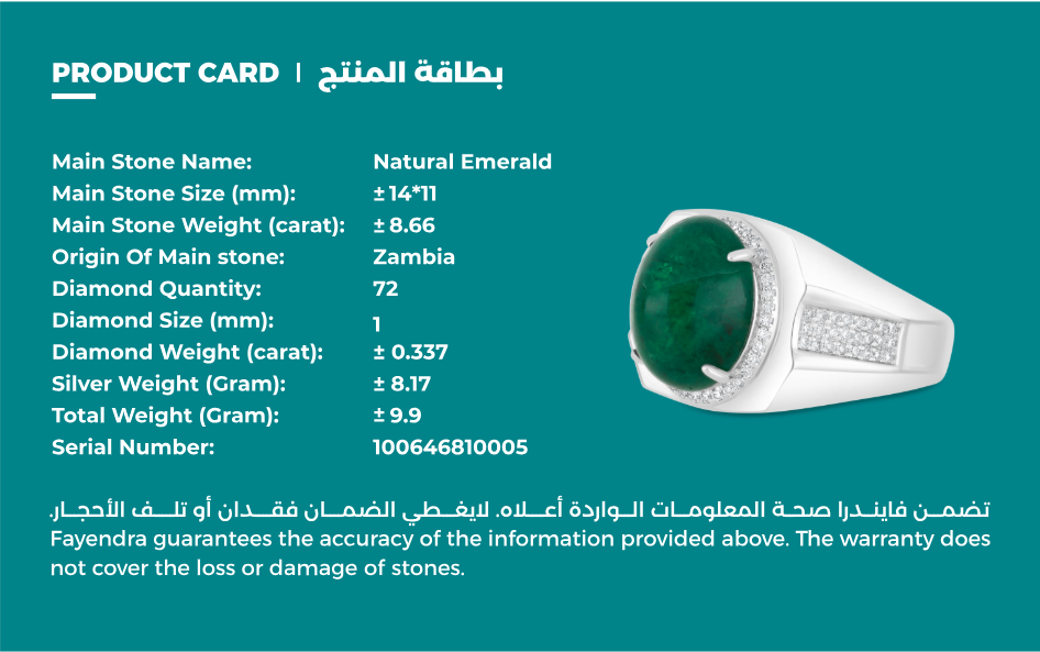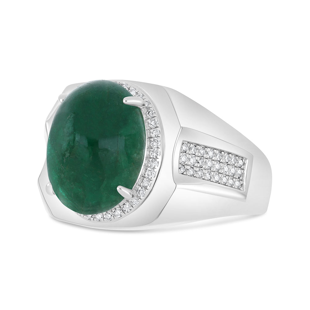 خاتم رجالي فضة عيار 925 مطلي روديوم مرصع احجار الزمرد الطبيعي و الالماس الطبيعي