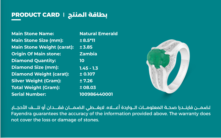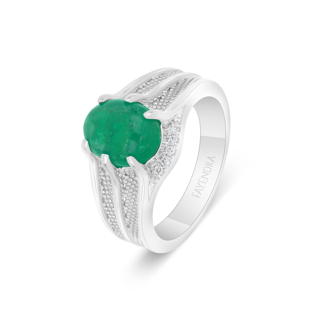 خاتم رجالي عيار 925 مطلي روديوم مرصع بحجر الزمرد الطبيعي و الالماس الطبيعي سي في دي جودة في في اس