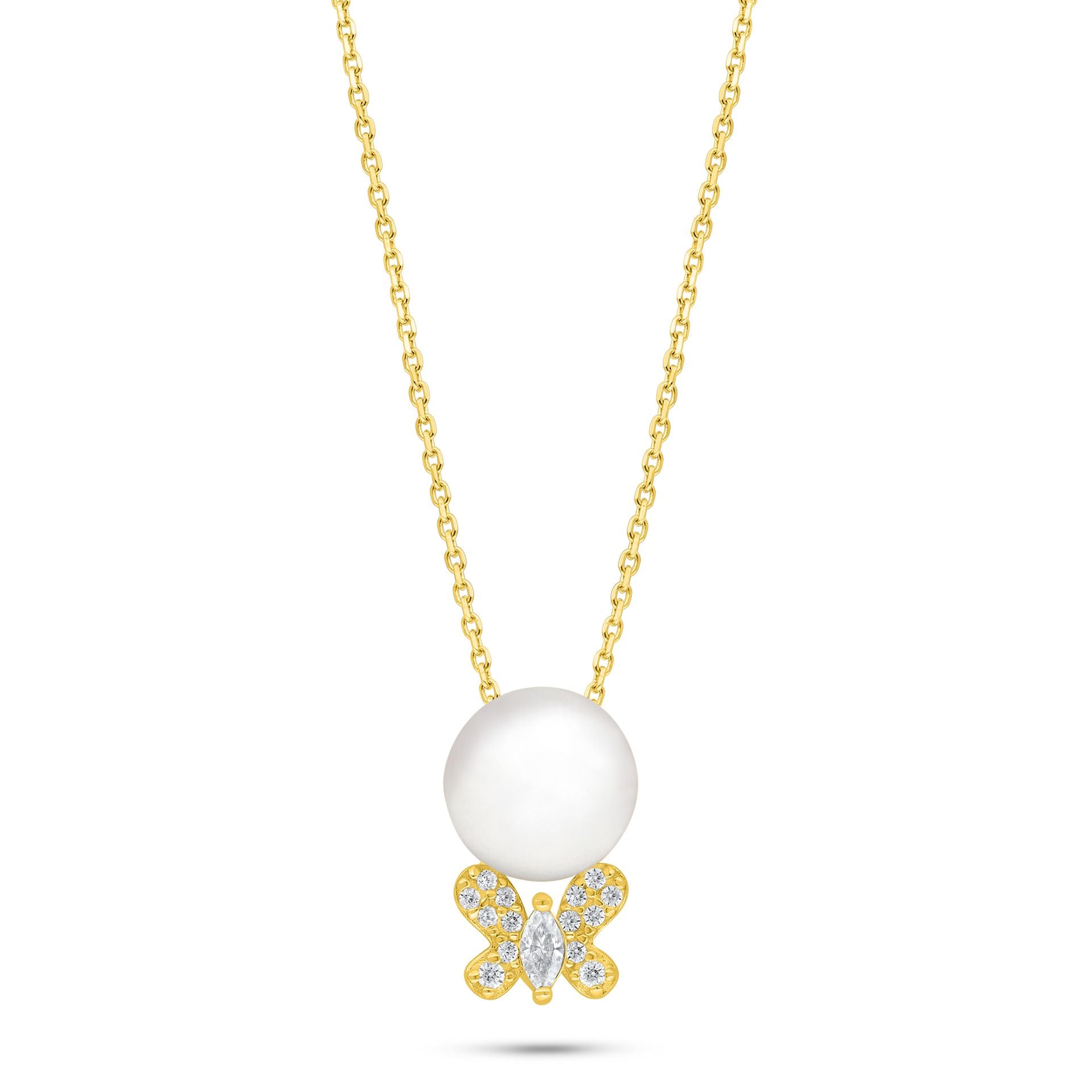 اظهري بإطلالة عصرية في غاية التألق مع هذا العقد المميز، المصنوع من الفضة الإسترلينية عيار 925 والمطلي بطبقة من اللون الذهبي البهيج. يتميز بتصميم فراشة ناعم وأنيق مرصّعة بالكامل بأحجار الزركون الأبيض المضيء، ويزيّن منتصفها حجر زركون بقصة ماركيز يخطف الأنظار. في أعلى الفراشة تستقر لؤلؤة طبيعية تضيف لمسة فريدة من الفخامة والأنوثة. قطعة مميزة يستحق أن يكون في مجموعتك. اضيفيه الى مجموعتك الان!