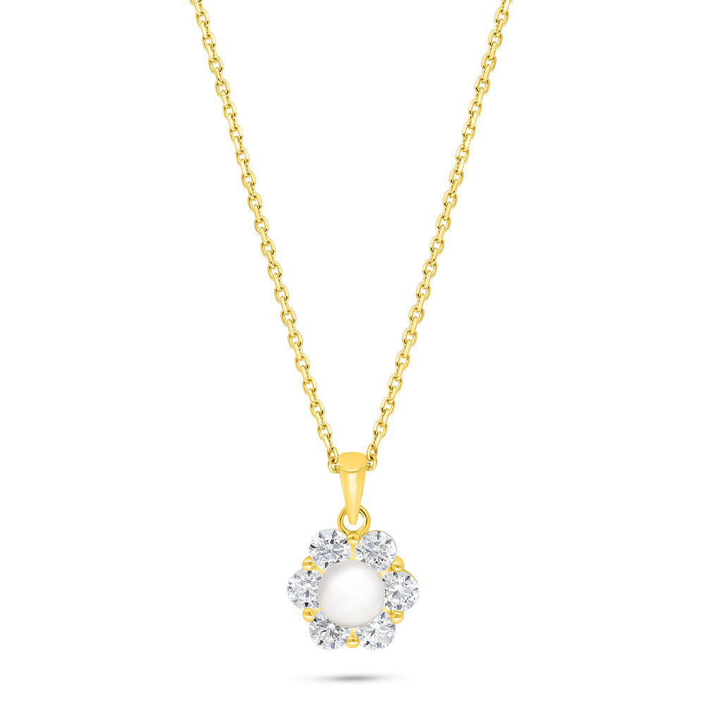 عقد من الفضة الخالصة عيار 925 مطلي ذهبي مرصع لولو ابيض طبيعي و فص ابيض