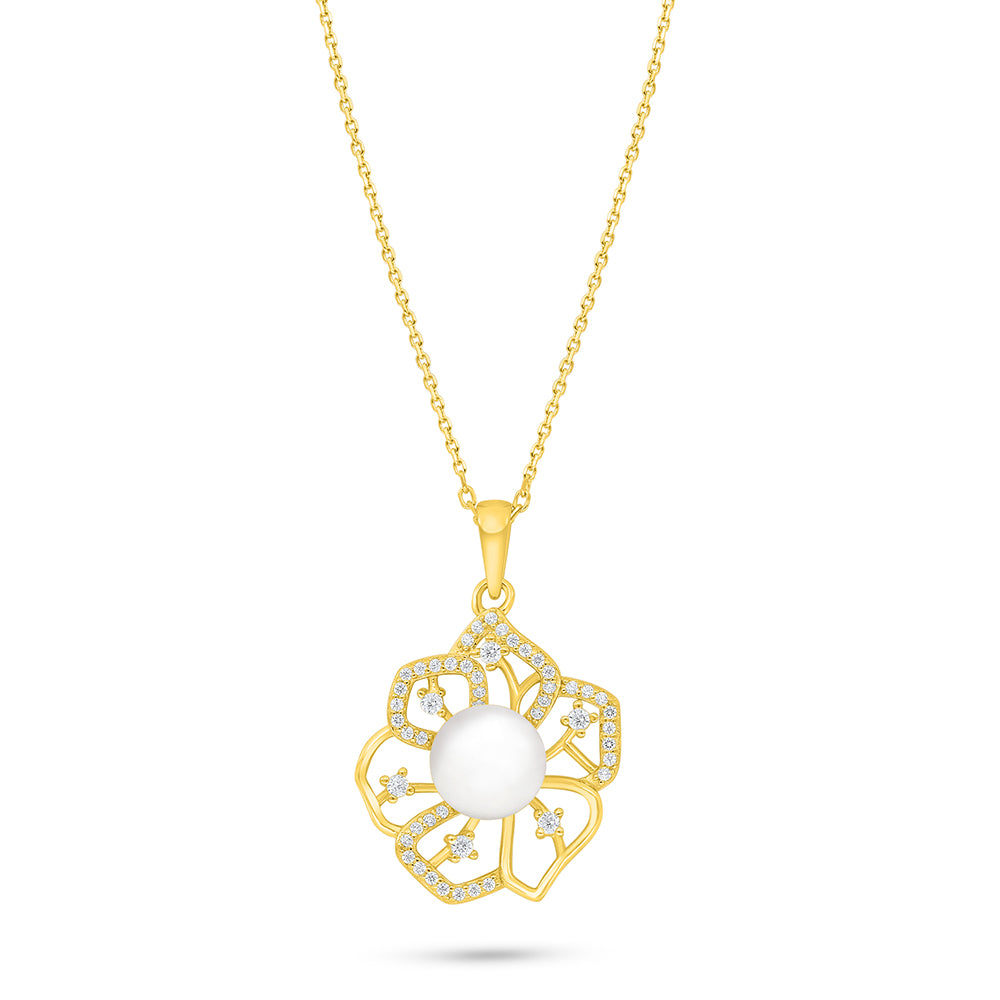 عقد من الفضة الخالصة عيار 925 مطلي ذهبي مرصع لولو ابيض طبيعي و فص ابيض