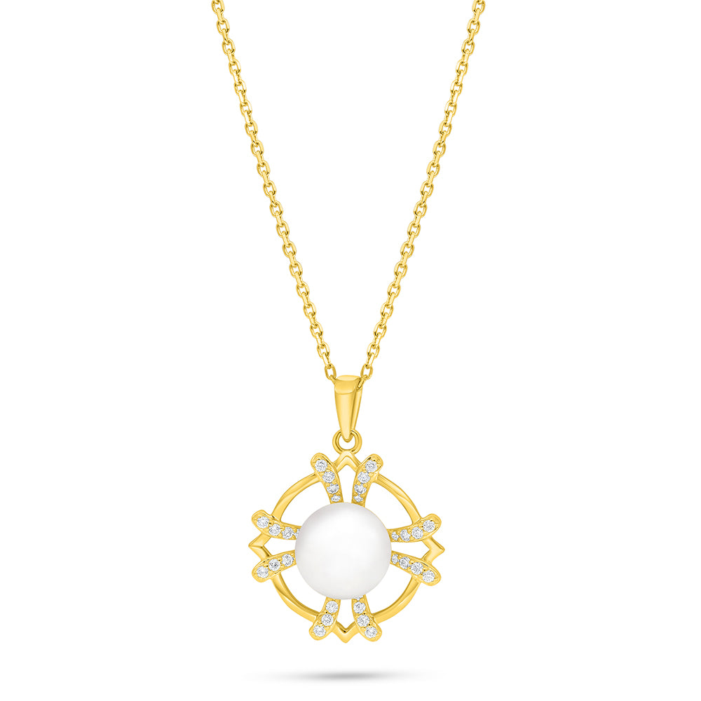 عقد من الفضة الخالصة عيار 925 مطلي ذهبي مرصع لولو ابيض طبيعي و فص ابيض