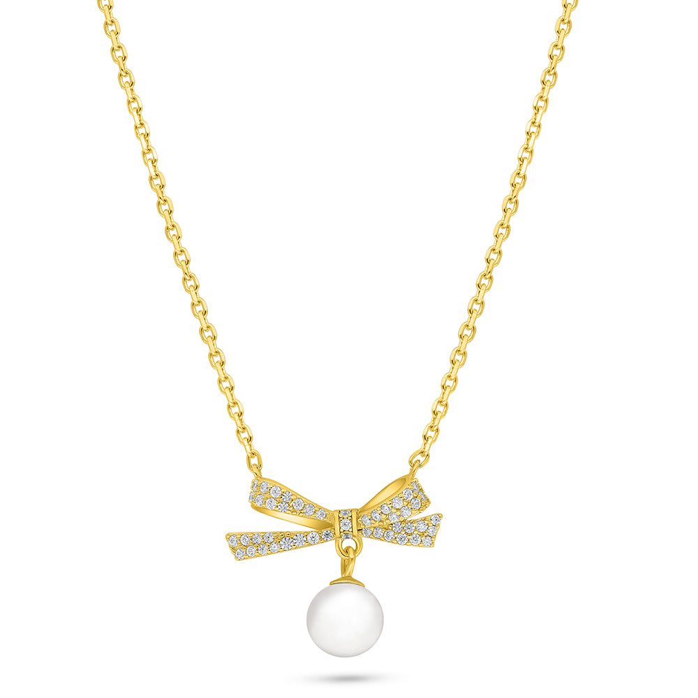 عقد من الفضة الخالصة عيار 925 مطلي ذهبي مرصع لولو ابيض طبيعي و فص ابيض
