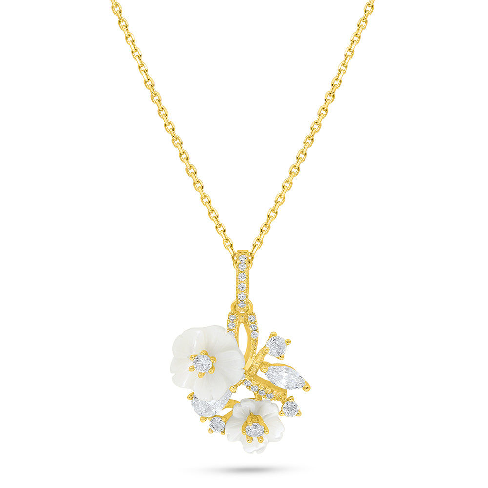 عقد من الفضة الخالصة عيار 925 مطلي ذهبي مرصع صدف ابيض و فص ابيض