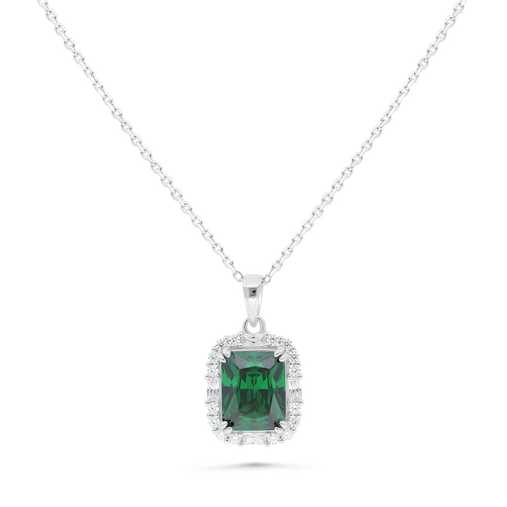قلادة أنيقة من الفضة الإسترليني عيار 925 مرصع بحجر الزركون الزمردي المذهل بقصة ايميرالد ذو اللون الرائع واللمعان الآسر، تؤطره أحجار بيضاء متلألئة.