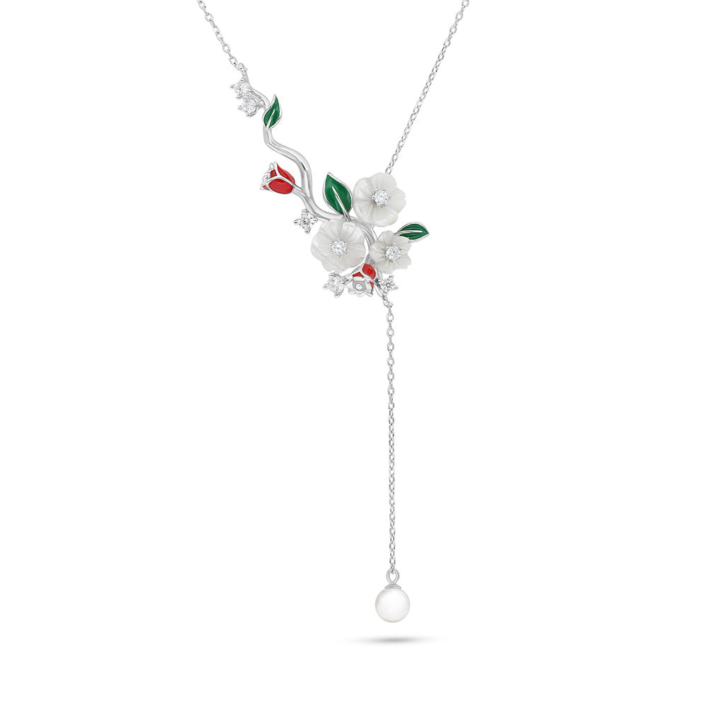عقد من الفضة الخالصة عيار 925 مطلي روديوم مرصع لولو ابيض طبيعي و صدف ابيض و فص ابيض
