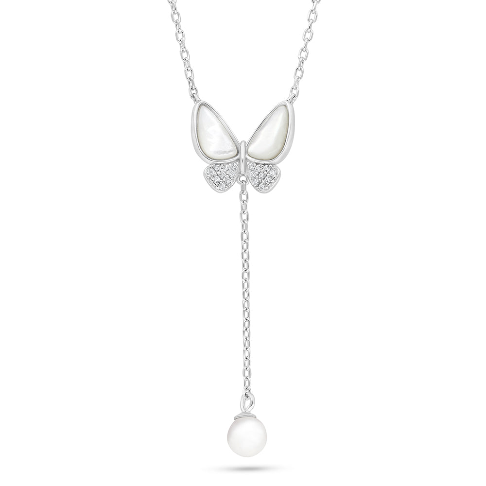 عقد من الفضة الخالصة عيار 925 مطلي روديوم مرصع صدف ابيض و لولو ابيض طبيعي و فص ابيض