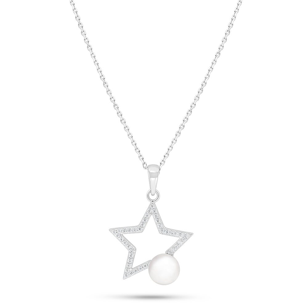 تألقي بسحر النجوم مع هذا العقد الساحر المصنوع من الفضة الإسترلينية عيار 925. حيث ينسدل من العقد تعليقة على شكل نجمة متلألئة، مرصعة بالكامل بأحجار الزركون الأبيض التي تعكس الضوء بلمعان أخّاذ، بينما يزيّن طرف النجمة لؤلؤة طبيعية تضفي لمسة من الأناقة الراقية والتفرد. عقد مثالي لإبراز جمالك في كل مناسبة، يجمع بين الرقة والفخامة في تصميم واحد. اقتنيه الآن وأضيفي لمجموعتك قطعة تفيض بالسحر!
