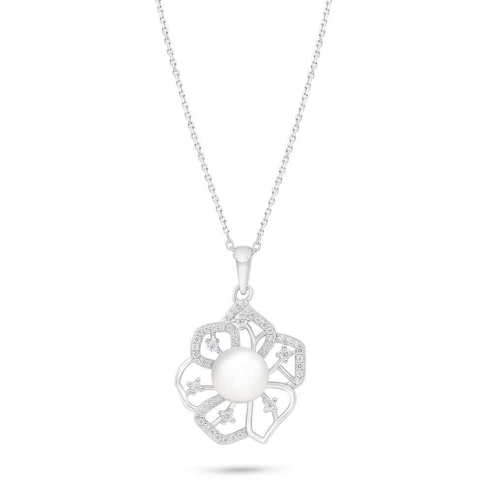 عقد من الفضة الخالصة عيار 925 مطلي روديوم مرصع لولو ابيض طبيعي و فص ابيض