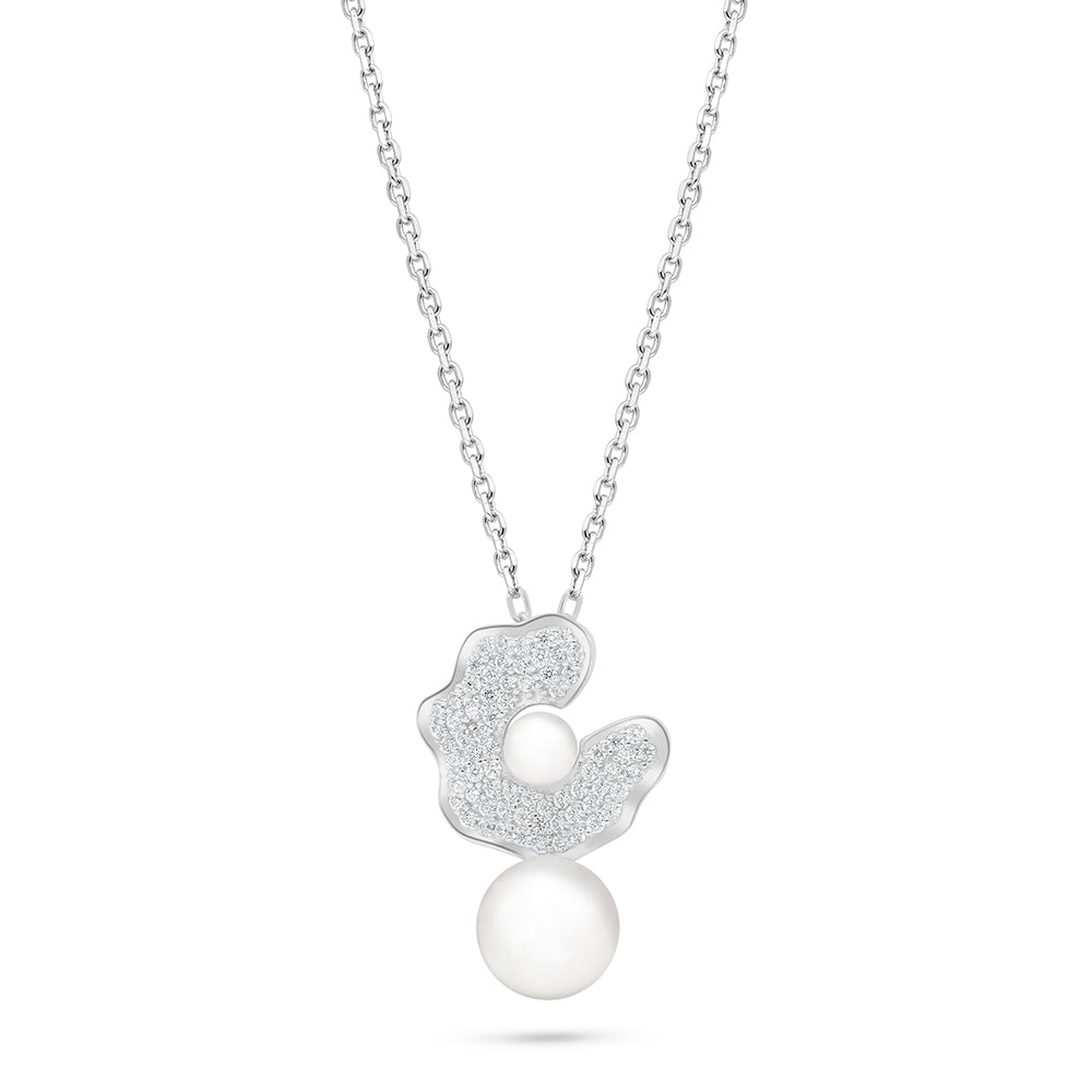 عقد من الفضة الخالصة عيار 925 مطلي روديوم مرصع لولو ابيض طبيعي و فص ابيض