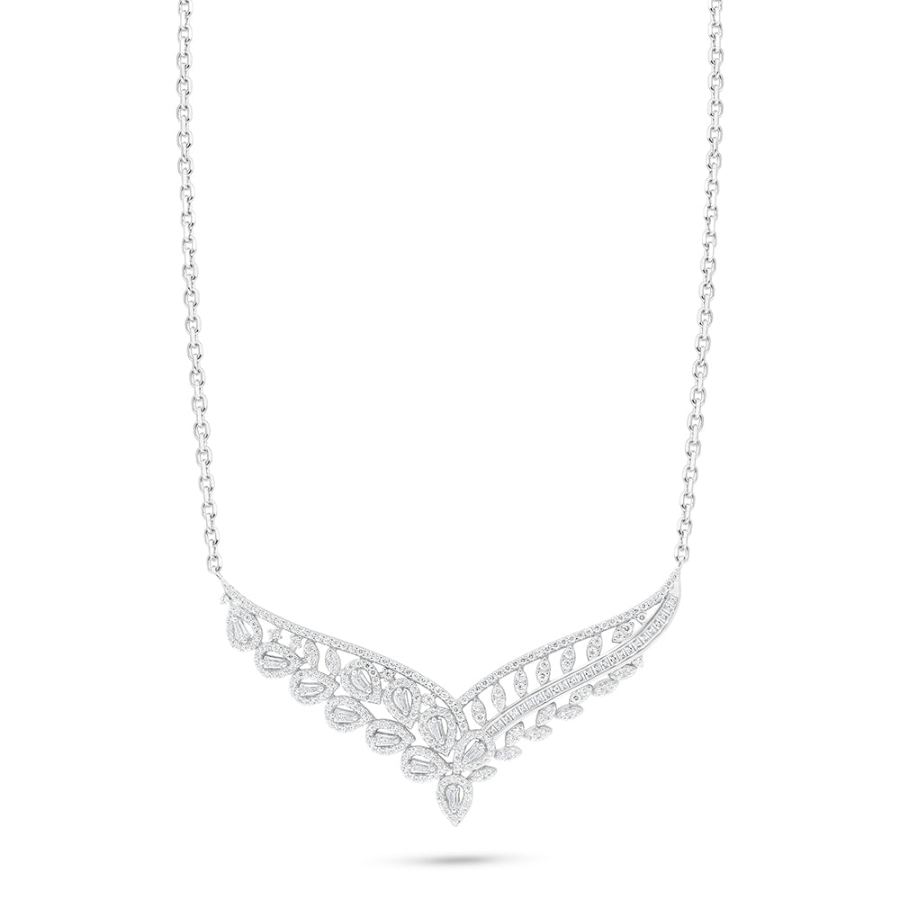 Total Weight: 8.4g استمتعي بإطلالة ملكية تخطف الأنظار مع هذا العقد الساحر المصنوع من الفضة الخالصة عيار 925 والمطلي بالروديوم لبريق يدوم ويُضاهي لمعان الفخامة. يتألّق العقد بتصميم فاخر مرصّع بأحجار زركون بيضاء لامعة بتنوع فريد في القصّات: من قصّة ماركيز الانسيابية التي تحاكي أوراق الشجر، إلى قصّة الباجيت الهندسية الأنيقة، وصولاً إلى قصّة بريليانت الكلاسيكية التي تعكس الضوء بكل زهو. تناغم الأحجار وتوزيعها البديع يضفي على التصميم بعداً فنياً غنياً بالتفاصيل، لتكون كل زاوية فيه انعكاسًا للذوق الرفيع والأناقة الراقية. قطعة مثالية تليق بالسهرات والمناسبات الفاخرة، وتمنحك حضورًا مميزًا لا يُنسى. أضيفيها إلى مجموعتك الآن ودعيها تعبّر عن أناقتك ببريق استثنائي!