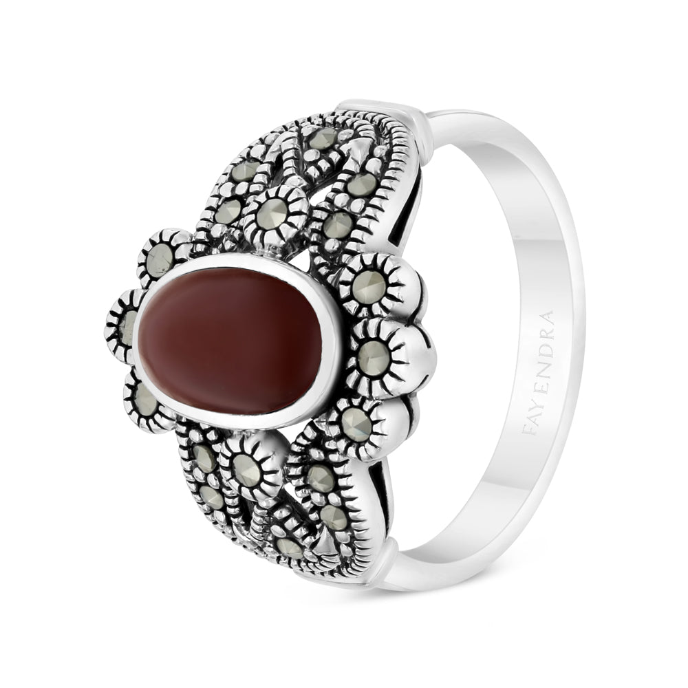 لأن الرقة تًلازم طباعك، هذا الخاتم بتصميمه الرقيق والعذب بقطعة مركزية من حجر العقيق الطبيعي ومرصع بأحجار الماركسايت اللامعة مُناسب للارتداء اليومي وفي المناسبات ايضاً.