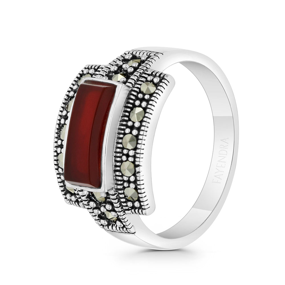 خاتم فضة كلاسيكي مرصع بأحجار الماركاسيت الصافية ذات اللمعان الرائع، يتوسطه حجر عقيق احمر طبيعي معالج بقصة مستطيلة. .