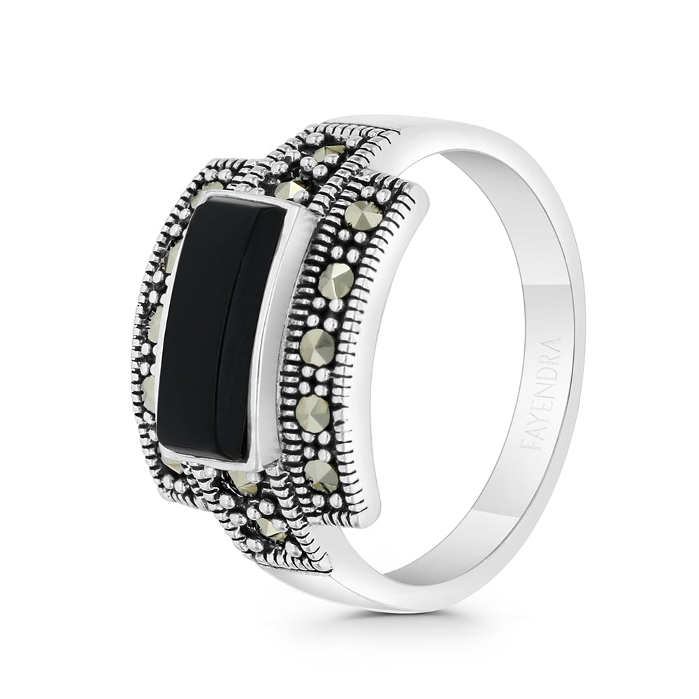 خاتم فضة كلاسيكي مرصع بأحجار الماركاسيت الصافية ذات اللمعان الرائع، يتوسطه حجر أونيكس طبيعي معالج بقصة مستطيلة. .