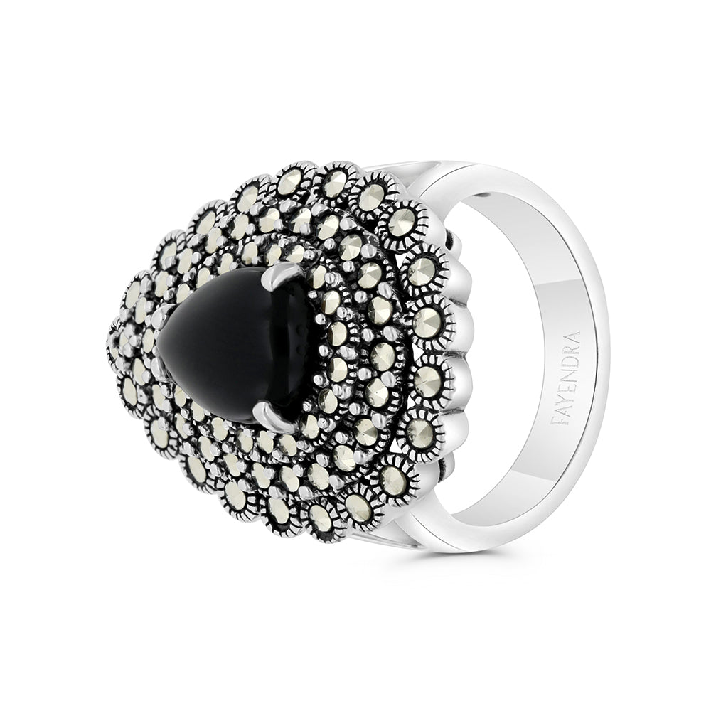 اضافة المزيد من الجاذبية لهذا الخاتم الكلاسيكي ، تم ترصيع أحجار ماركاسيت النقيّة بشكل فنيّ حول حجر الأونكس. التناقض المذهل بين الماركاسيت المتلألئة والجمال العميق الغامض للأونكس يخلق تأثيرًا بصريًا ساحرًا من شأنه بالتأكيد أن يلفت الأنظار ويزيدك جمالا ورونقاً.