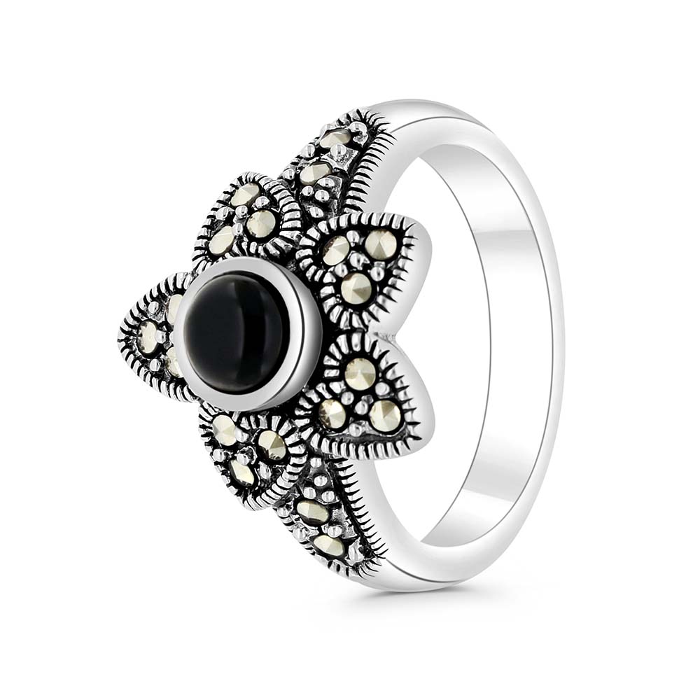 خاتم من الفضة الإسترليني مزين بأحجار الأونيكس والماركاسيت يتألق باللون الأسود العميق وللمعان الرائع.