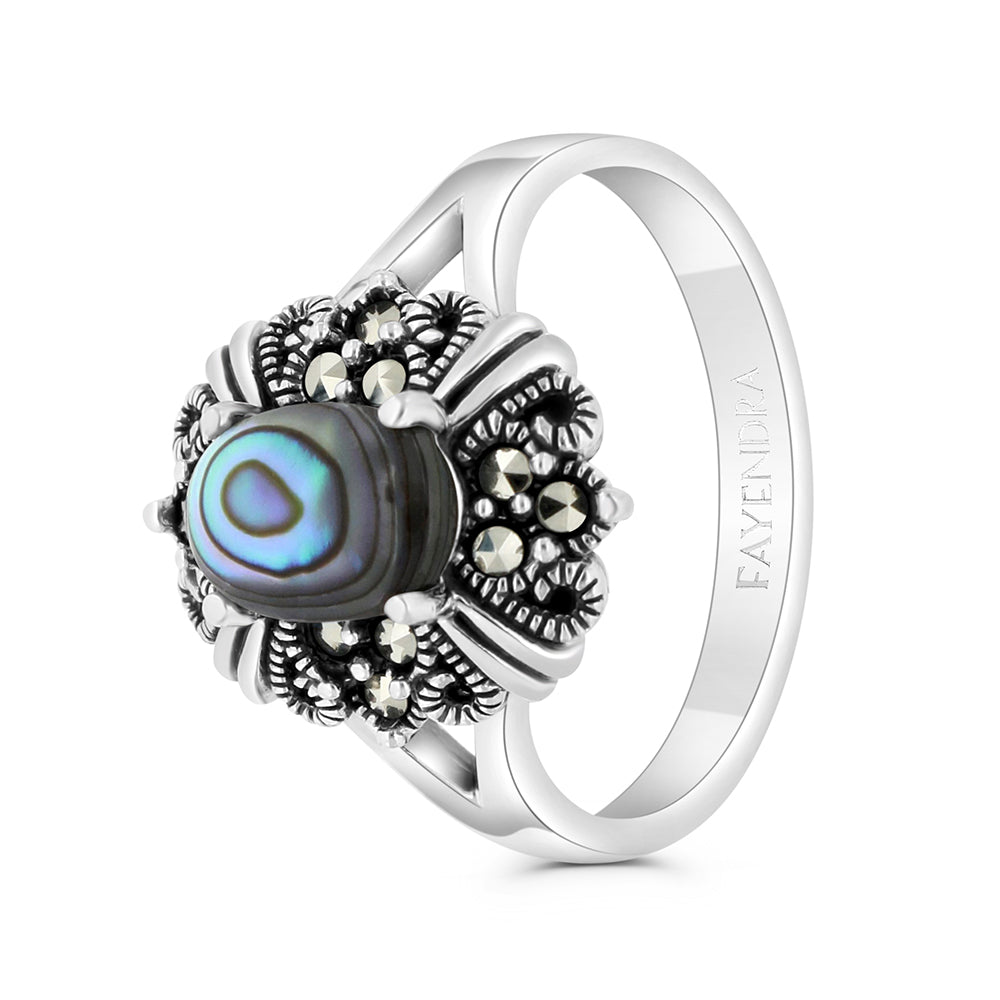خاتم من الفضة الخالصة عيار 925 مرصع احجار صدف استرالي طبيعي و ماركسايت