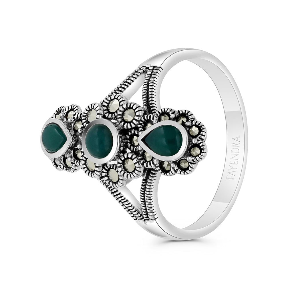 الخاتم الأنيق مزين بثلاثة أحجار عقيق اخضر مركزية ، اثنان منها بقصة الدمعة وواحد بقصة دائرية إلى جانب أحجار ماركاسيت لامعة.